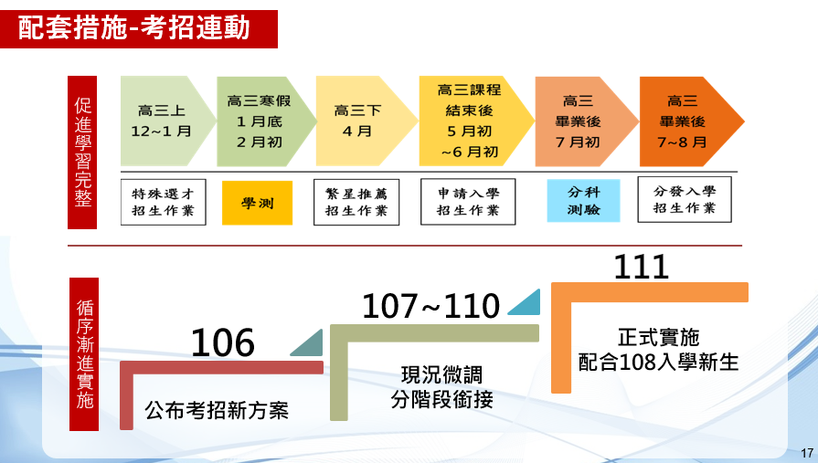 為使社會大眾更廣泛了解108課綱的理念及升學考招變革,近期教育部也組成108課綱宣講團,對課綱配套措施、學習歷程檔案、大學及技專考招新制等主題,與家長及各界人士進行更多的對話,期使社會大眾更了解並支持新課綱,一起鼓勵孩子用全新的態度,進行更有效、更具核心素養的學習。期待每個孩子都能因108課綱更適性地探索自己的學習及發展,以期成就每個孩子,並幫助他們成為終身的學習者。