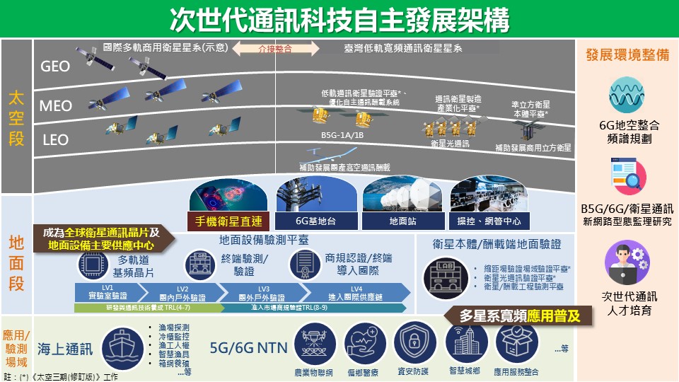 為落實賴總統五大信賴產業之「次世代通訊產業」及「競逐太空,探索海洋」等施政藍圖,本院於113年10月召開「衛星通訊產業策略(SRB)會議」,會後國科會彙整與會專家與業界先進建議,協同經濟部、數發部、教育部、通傳會及國家太空中心,共同擬具「次世代通訊科技發展方案」,以強化我國通訊產業既有優勢與未來競爭力,並掌握2030年6G商用化之發展契機,促進國家數位科技發展與提升民眾社會福祉。