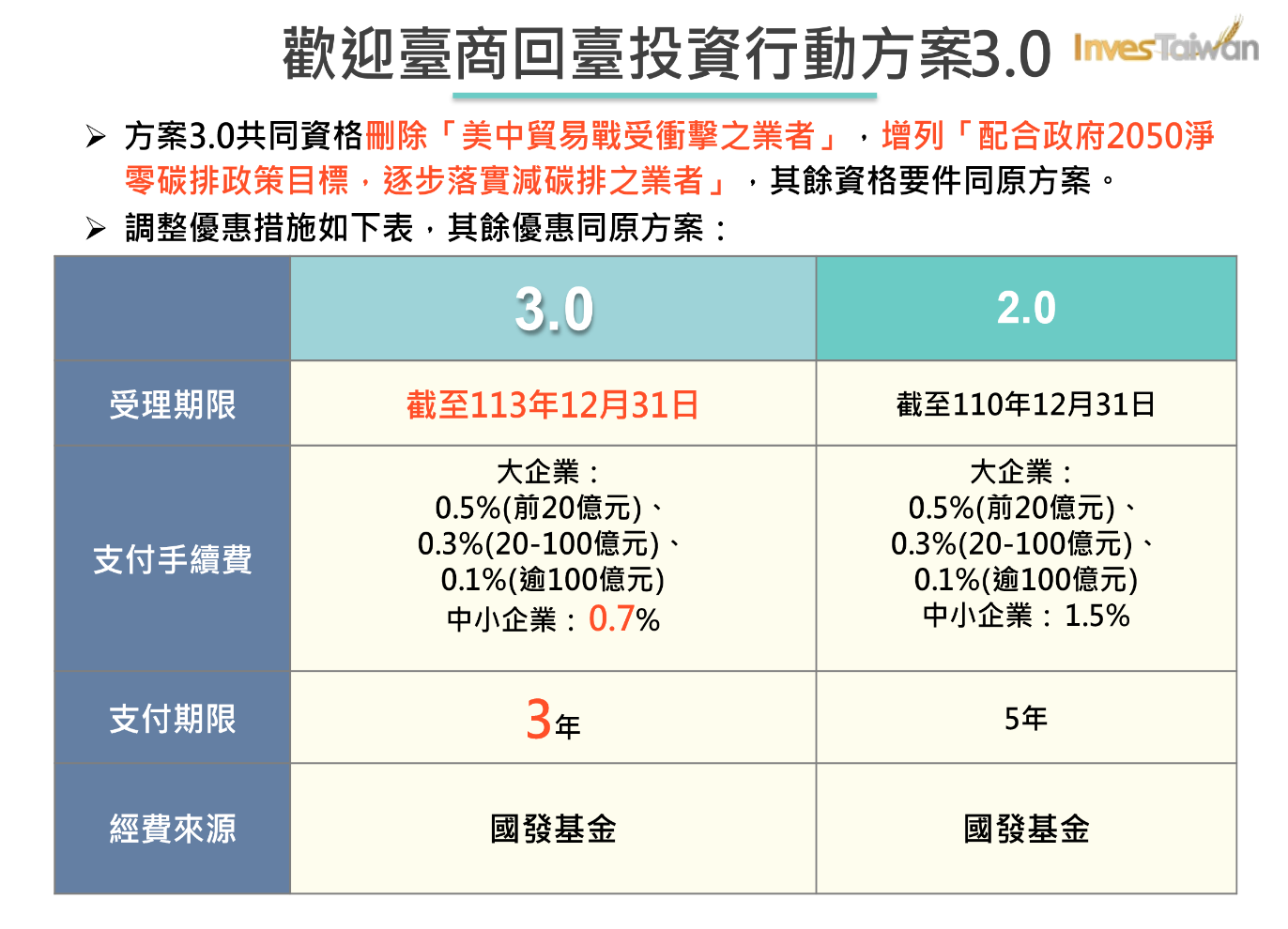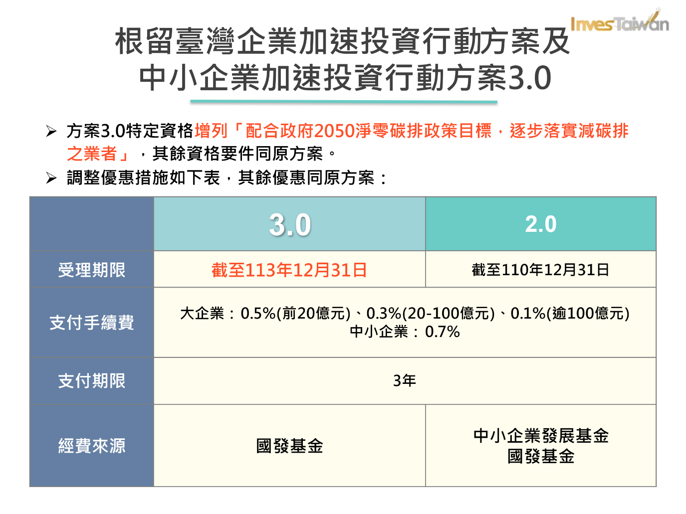 由於全球市場快速變動,包括中國大陸能耗雙控、共同富裕、沿海缺工等投資環境改變,並為鼓勵廠商持續在臺投資,投資臺灣三大方案原訂至110年底截止,將延續至113年,鎖定配合政府2050淨零碳排政策目標,逐步落實減碳排之業者,預計帶動投資達9,000億元,三大方案調升4,300億元額度,期望在三大方案延長施行期間,加速協助申請廠商安心投資,提升競爭力及追求永續發展。
