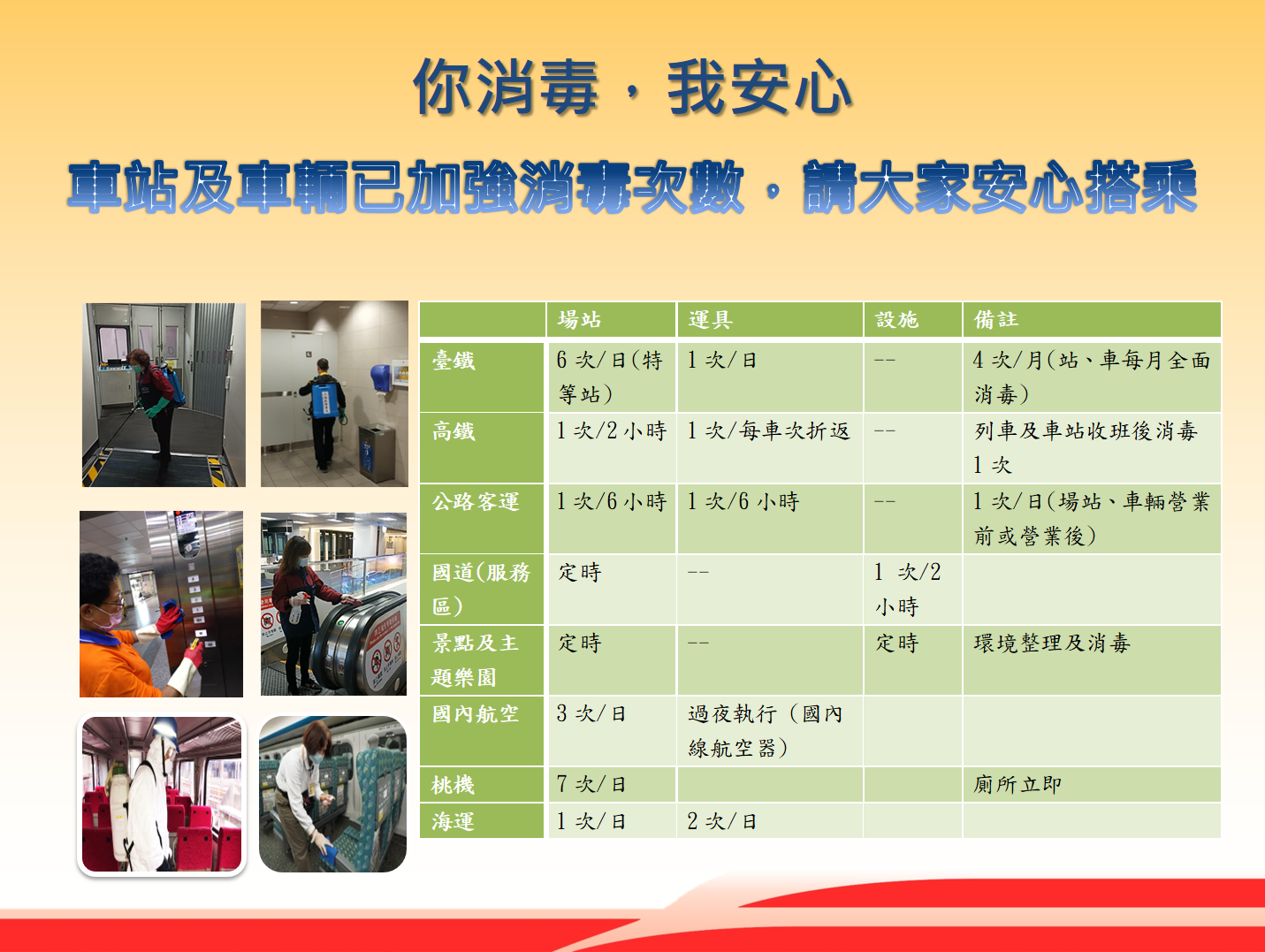 三、加強消毒頻次:場站及運具原則每日至少消毒1次,並視需要增加次數(高鐵列車每一往返1次、公路客運每6小時1次)。