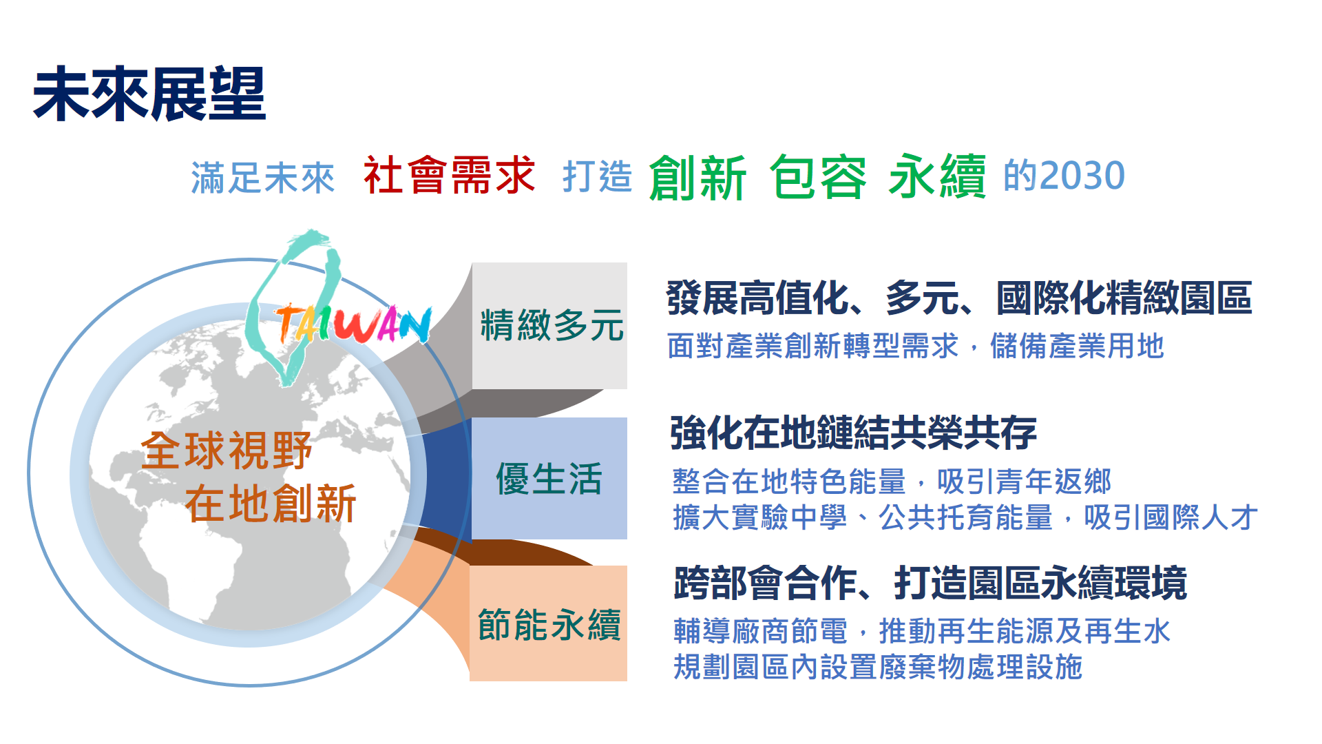 近年來因應半導體、軟體、智慧醫療、智慧農業、智慧車輛、太空科技等新興產業需求,為儲備產業用地及區域均衡發展,創造就業機會並促進人才回流,完善生活機能與環境基礎設施,本院自108年迄今已核定7個新設及擴建園區籌設計畫,包含橋頭園區、臺南園區3期、竹科 X 基地、寶山園區2期、台中園區2期、屏東及嘉義園區等,各個計畫符合產業需求如期推動中,預期將可提供就業機會3萬個、年產值1.26兆元。