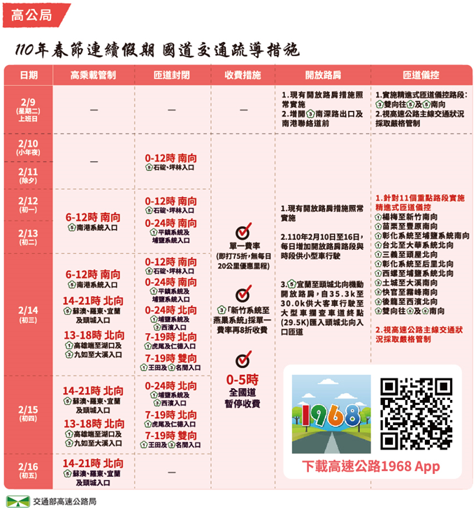 (一)國道部分:持續辦理精進式匝道儀控、入口匝道儀控、高乘載管制、匝道封閉、開放路肩及於2月10日至16日,每日0至5時國道全線暫停收費等措施。