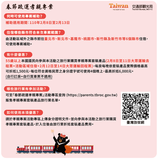 (八)觀光部分:交通部在今年春節2月8日至2月13日期間,特別補助55歲以上本國國民購買「孝親專案套裝產品」費用,以「住宿」+「臺鐵、高鐵、國道客運及飛機(遊覽車不適用)」等配套專案予以規劃,並以北部區域之縣市(臺北市、新北市、基隆市、桃園市、新竹縣及新竹市)為實施區域,期紓緩部分南返之車潮。