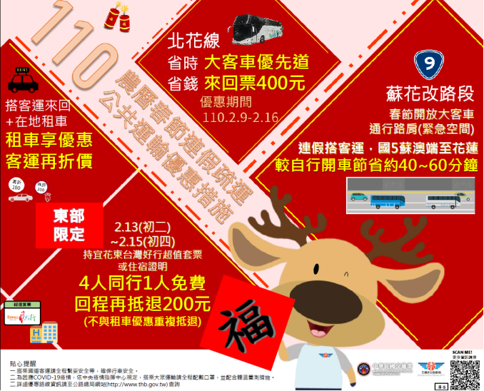 (三)公路客運部分:提供民眾搭乘國道客運享有票價及轉乘優惠(如:90條國道客運路線享平日優惠或原票價85折、46條台灣好行路線持電子票證享半價優惠、以及10小時內轉乘在地客運享一段票或基本里程免費);另搭乘國道客運前往東部再加碼票價與租車優惠(如:北花線來回票400元,以及在指定日期4人同行1人免費,以及持國道客運購票證明租車再享優惠)。