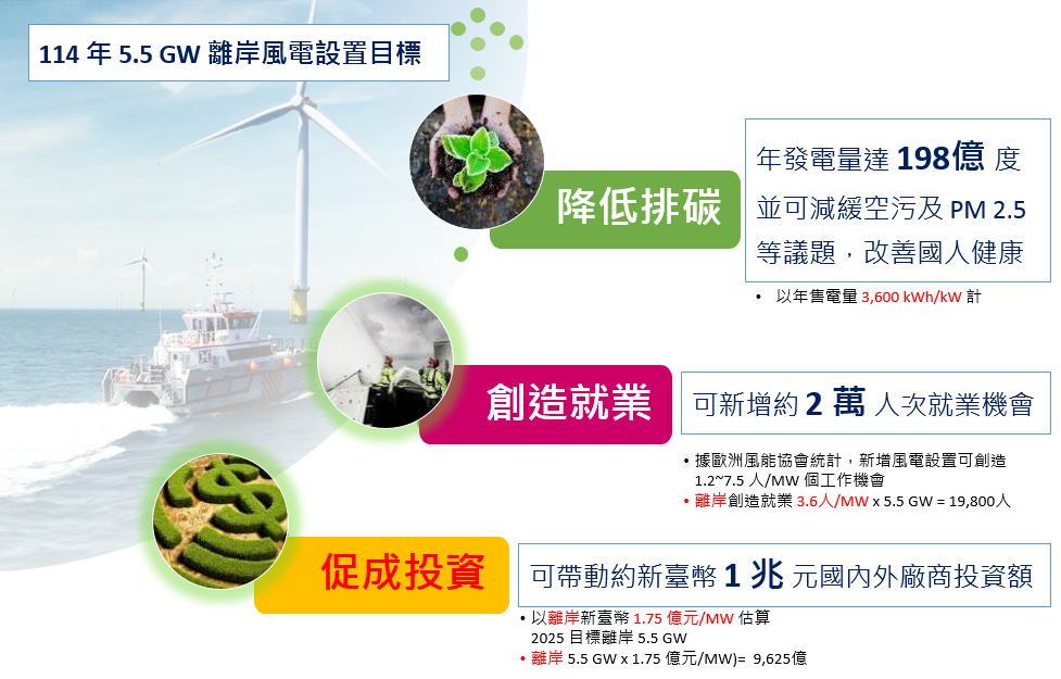 預期114年離岸風電的發展將創造累計投資額達新臺幣9,625億元,創造約2萬個就業機會,同時帶動年減碳量達1,047萬噸,約相當於26,926個大安森林公園年減碳量,將有利於實現強化能源安全、創新綠色經濟、促進環境永續等政策願景。