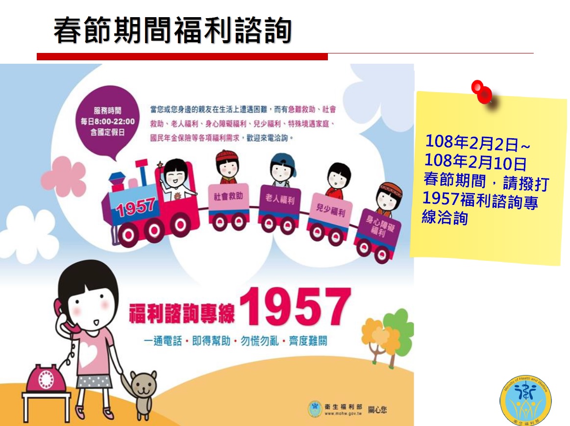 三、衛福部及教育部將持續宣導,加強加相關資訊及懷服務輸送到有需要之家庭,而春節期間民眾如有需求亦可運用衛福部之福利諮詢專線1957尋求協助。