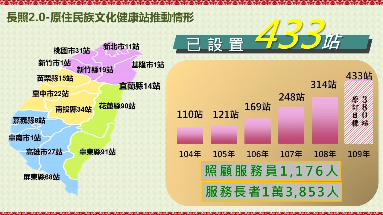 109年,全國設置文健站共433處,培植在地族人擔任照服員1,176人,照顧長者1萬3,853人,提供原住民族長者連續性、可近性及具文化性之專業照顧服務,成功的將文健站打造為部落原住民族長者的第二個家。