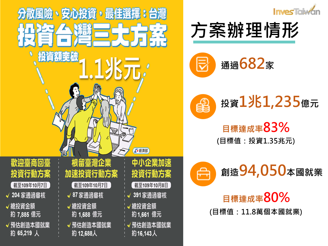 1. 美中貿易戰與疫情衝擊,臺商將持續調整全球投資布局以因應歐美客戶要求,同時帶動中小企業與根留臺灣企業為主的第二階、第三階供應商陸續在臺投資。投資臺灣三大方案廠商申請踴躍,已有682家廠商投資突破新臺幣1兆1,235億元,創造94,050個本國就業。