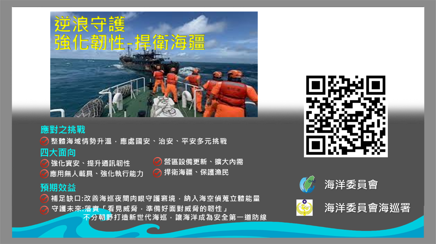 4、捍衛海疆,保護人民:新造抗風耐浪及防撞巡防艦艇,籌補海巡艦船艇應對灰色衝突裝備,提升海域執法能量,保障漁民安全。