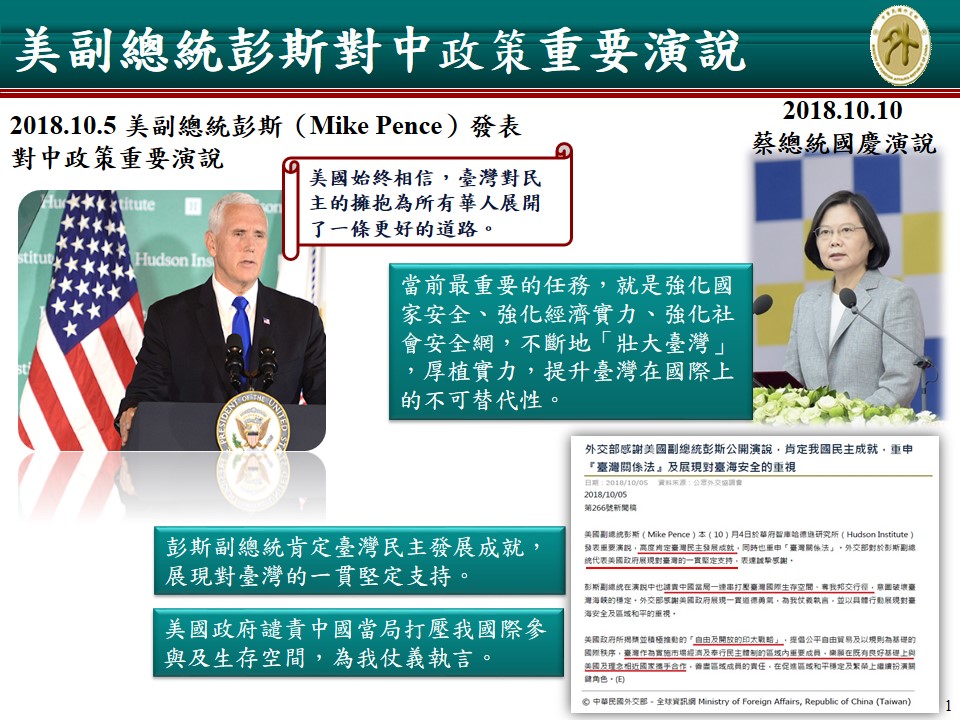 一、 美中衝突與對抗有長期化趨勢,政府相當重視整體情勢發展對臺灣可能影響,總統已召開國安高層會議研議對策,並於昨日國慶演說中公開宣示國家發展方向。行政院將秉持蔡總統於昨日國慶演說中所指示,以「求穩、應變、進步」等原則因應,持續強化國家安全、強化經濟實力、強化社會安全網,壯大臺灣,厚植實力,以提升臺灣在國際上之不可替代性,確保臺灣永續生存,並致力維護兩千三百萬人民自由民主之生活方式,維持臺海和平與區域穩定,讓臺灣在世界上變得不可或缺,也不可取代。