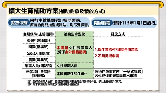 因應少子女化對策規劃【擴大生育補助方案─生育給付PLUS 生育補助至10萬】,預計於明(115)年1月1日開辦實施。