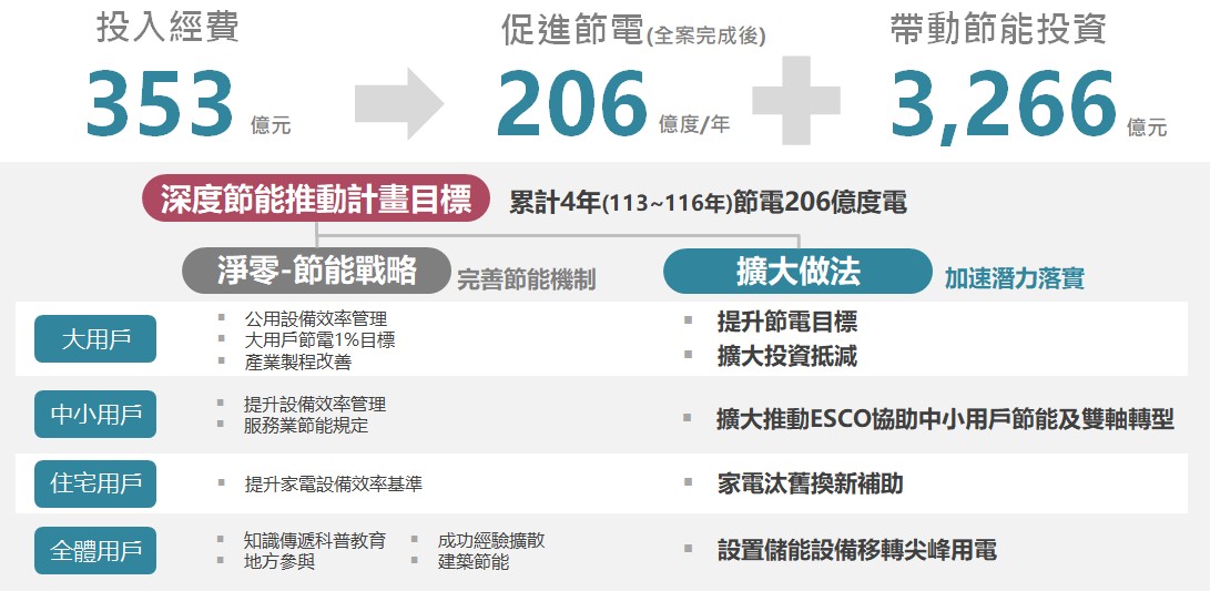 期藉由深度節能推動計畫持續達成COP28能效倡議,並透過各措施的推動,預計全程4年投入353億元,可促進節電206億度、相當於1,018萬公噸減碳效果,並帶動節能投資3,266 億元,後續政府將與產業、民間共同攜手,推動節能相關工作,期待全民參與,共同實現 2050 淨零排放的願景。