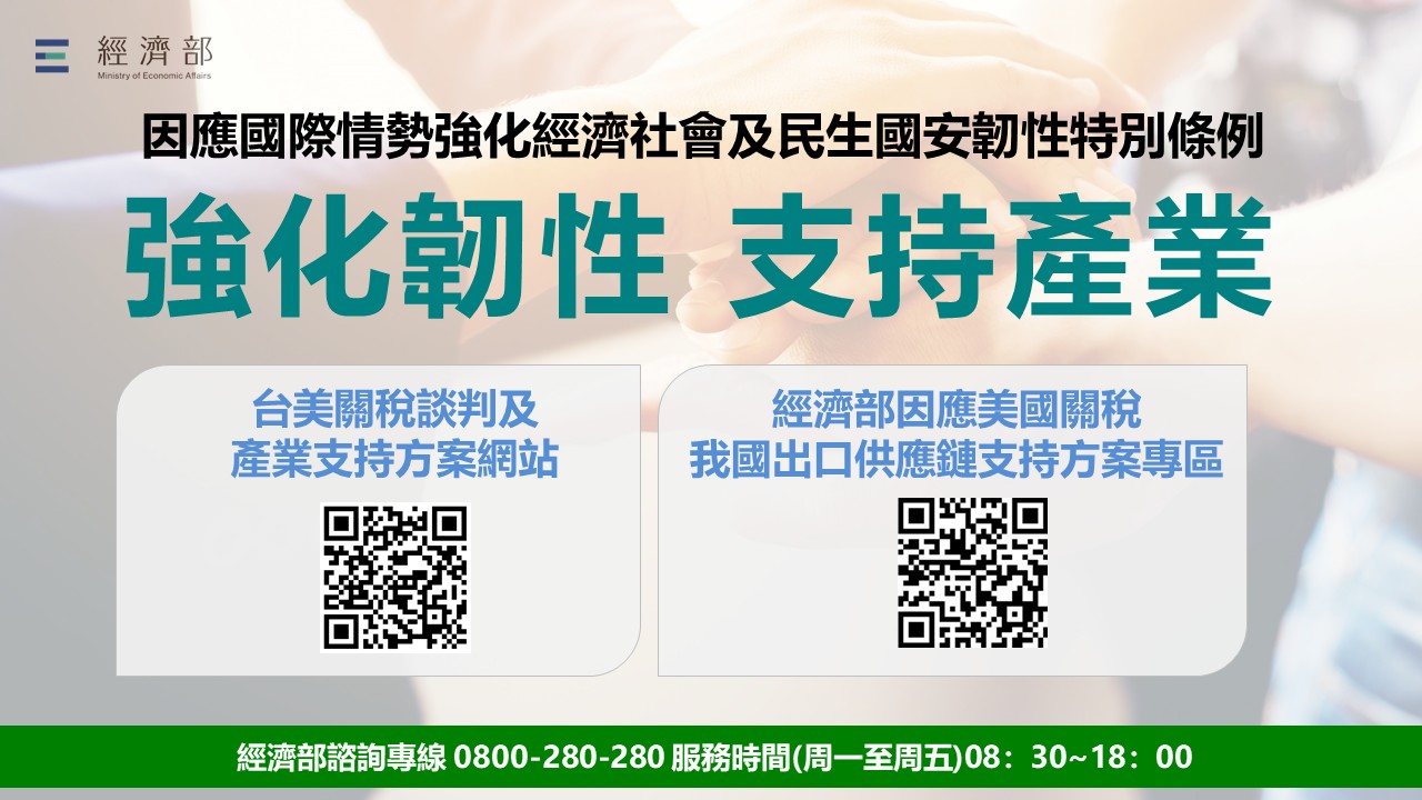 為因應美國關稅政策影響,行政院提出「因應國際情勢強化經濟社會及國土安全韌性特別條例」,編列特別條例預算5700億元,其中經濟部編列460億元,自本(114)年8月7日推動「外銷貸款優惠保證加碼」、「中小微企業多元發展貸款加碼」、「研發轉型補助」及「爭取海外訂單」等4項支持措施,已依移緩濟急原則受理申請。業者可撥打0800-280-280,或可至行政院臺美關稅談判及產業支持方案網站查詢(