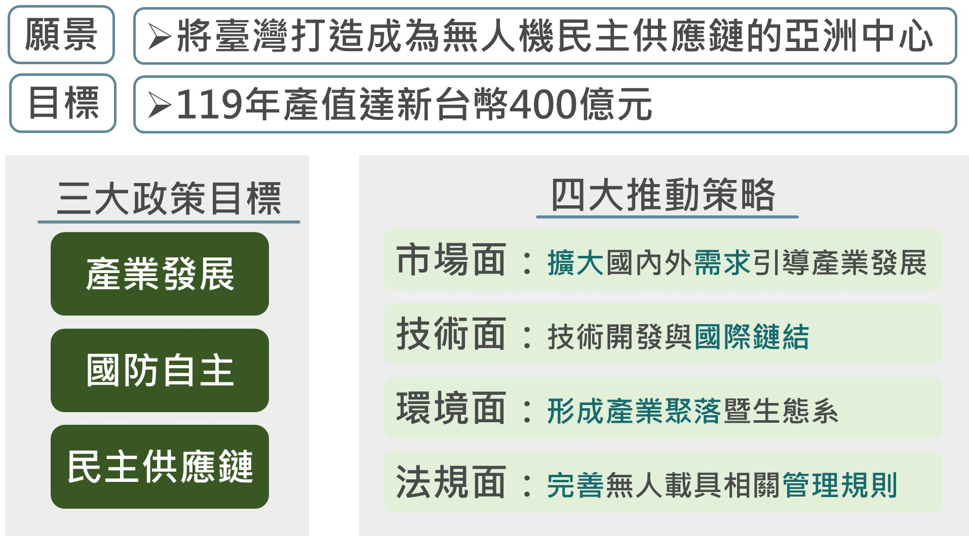 「無人載具產業發展統籌型計畫」以產業發展、國防自主及民主供應鏈三大目標為核心,擬定四大推動主軸,包括「擴大國內外需求引導產業發展」、「技術開發與國際鏈結」、「形成產業聚落暨生態系」及「完善無人載具相關管理規則」。由經濟部與各部會合作,加速擴大國內需求及用途開發,並對準國際非紅供應鏈轉單商機,帶動產業發展。