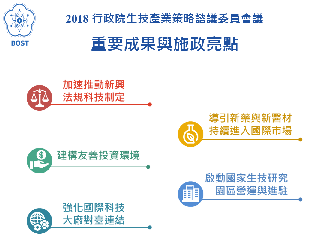 行政院為加速生醫產業發展與成長,強化政策與資源統籌功能,於2005年起逐年召開「行政院生技產業策略諮議委員會議(Bio Taiwan Committee, BTC)」,針對國家生技醫藥發展藍圖,提出重點議題及策略方向建議,作為部會署推動生醫產業之政策依循。2018 BTC會議重要成果與施政亮點: