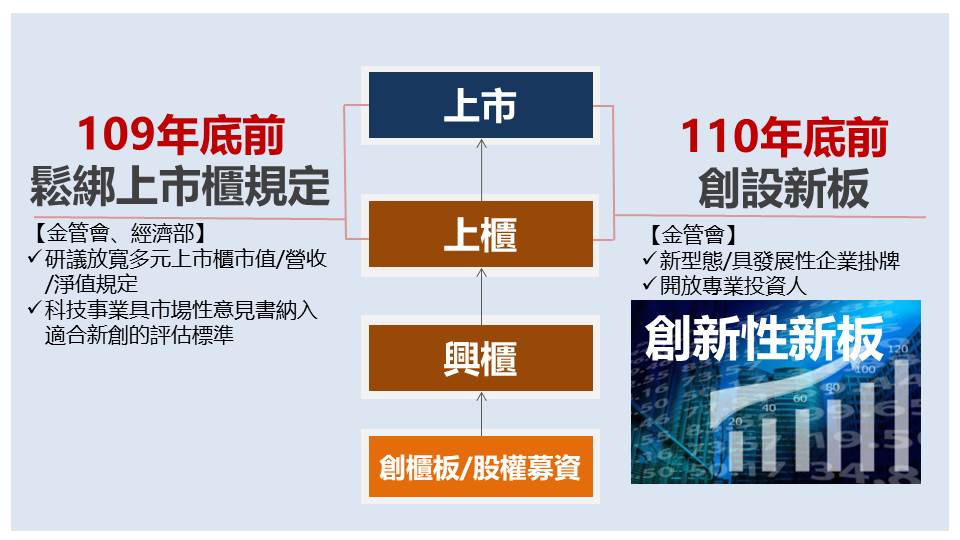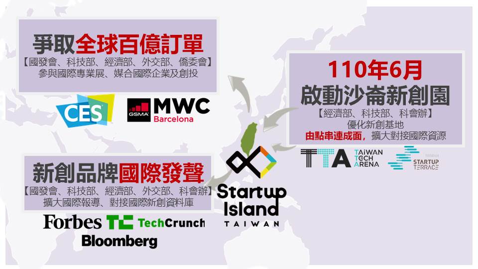 未來四年國發會、經濟部、科技部等13個機關,將投入百億元共同推動創新創業發展,強化協助新創出場(上市櫃或併購)、促成企業對新創投資(CVC)及加速拓展海外市場,並透過國家新創品牌「Startup Island TAIWAN」向國際發聲,以培育更多能引領臺灣新經濟產業發展的指標型新創。