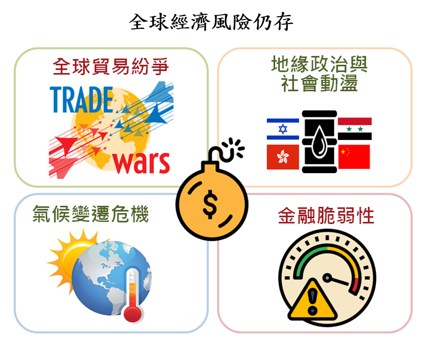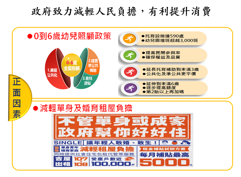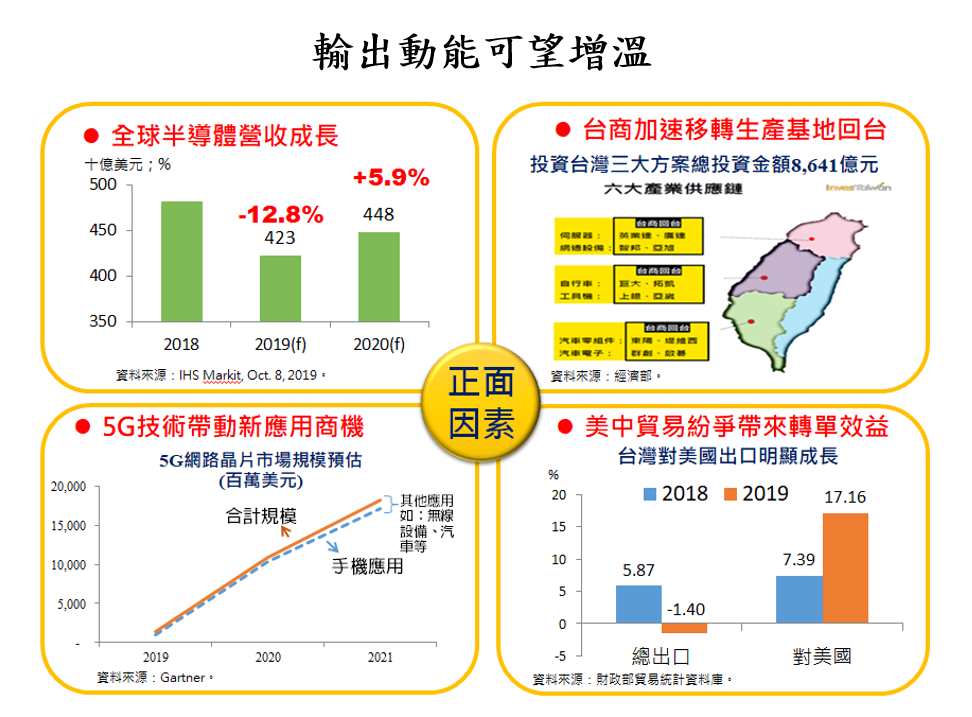 政府將掌握美中貿易摩擦契機,吸引產業與資金回臺,推動產業轉型、提升競爭力,並擴大投資、創造就業機會,促進經濟繁榮永續。但人口老化、區域經濟整合、全球貿易紛爭等不利因素及風險仍須持續關注,特別是近期新型冠狀病毒肺炎疫情有升溫跡象,政府會持續積極防疫,並協助民眾做好自主健康及衛生管理,全力將疫情衝擊降至最低。
