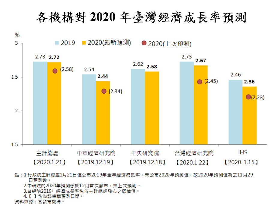 行政院院會今(30)日由國家發展委員會報告「2020經濟情勢展望」,2020年國際經濟復甦動能仍疲緩,但內需可望持續驅動經濟成長,近期主要機構陸續上調2020年臺灣經濟成長率預測,約介於2.36%至2.72%間,續呈溫和擴張,顯示政府近4年來致力推動經濟轉型,強化內需導向的成長模式,已發揮紓緩國際經濟波動衝擊之效果。