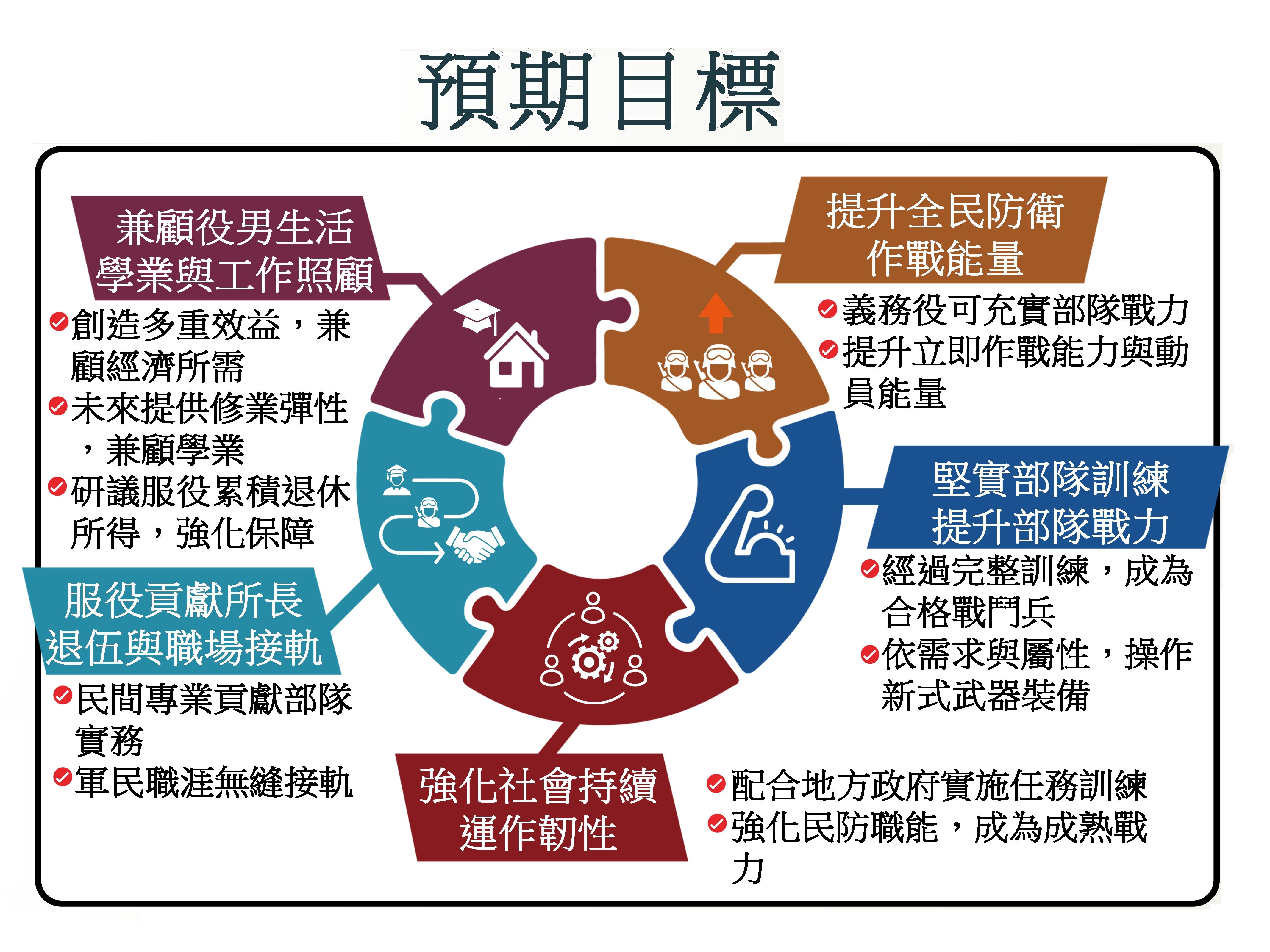 回復徵集1年期義務役,可建立適足的防衛戰力,展現中華民國堅定捍衛民主自由的決心,以確保國家永續發展及人民福祉。