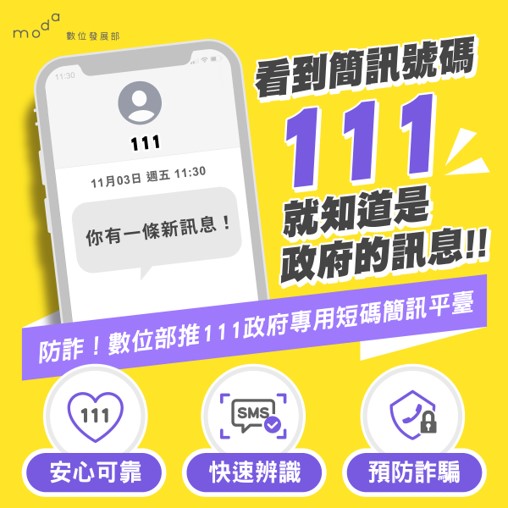 數位部建置111政府專屬短碼簡訊平臺,做為行政部門發送簡訊的信賴管道,只有透過此平臺的政府機關可以使用111短碼發送簡訊,民眾更容易辨識簡訊確實為公部門發送,達到只此一家、別無分號的效果。從今年9月起試辦迄今,已成功發送約8萬則111短碼簡訊,未來將擴大中央機關、地方政府共同加入,提升民眾信任,進一步降低民眾因簡訊遭受詐騙的風險。