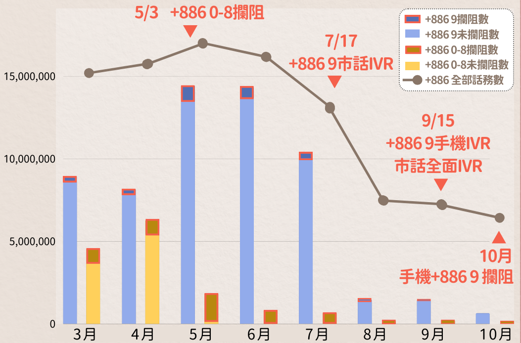 通傳會透過公私合力,要求電信業者攔阻偽冒我國號碼之境外來話,5月起實施「+8860-8」開頭之偽冒來話攔阻;10月起實施「+8869」開頭之偽冒來話攔阻,從源頭降低民眾接觸境外詐騙電話之數量。