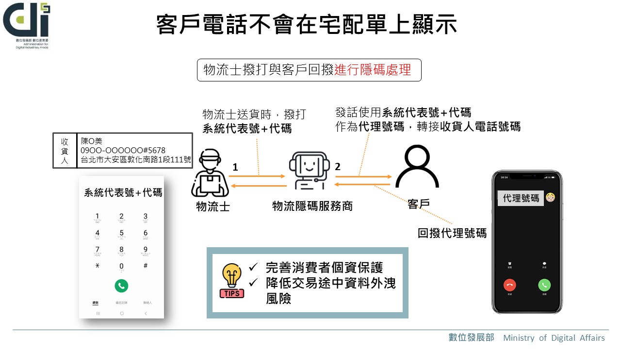 在推動電商業者導入物流隱碼技術部分,主要將原訂單收貨人聯絡電話號碼轉換為代碼,並在宅配單上同步進行隱碼處理,避免過去宅配單上顯示客戶電話,以致發生詐騙集團後續以如釣魚等方式進行各種詐騙攻擊。