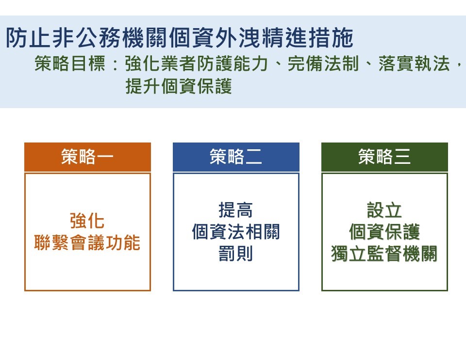 行政院院會今日由國家發展委員會報告「防止非公務機關個資外洩精進措施」,精進措施分為三項策略,策略一是強化「行政機關落實個人資料保護執行聯繫會議」功能、策略二是修正個資法提高相關罰則、策略三是依據憲法法庭111年憲判字第13號判決之意旨及參考國際趨勢設立個資保護獨立監督機關。