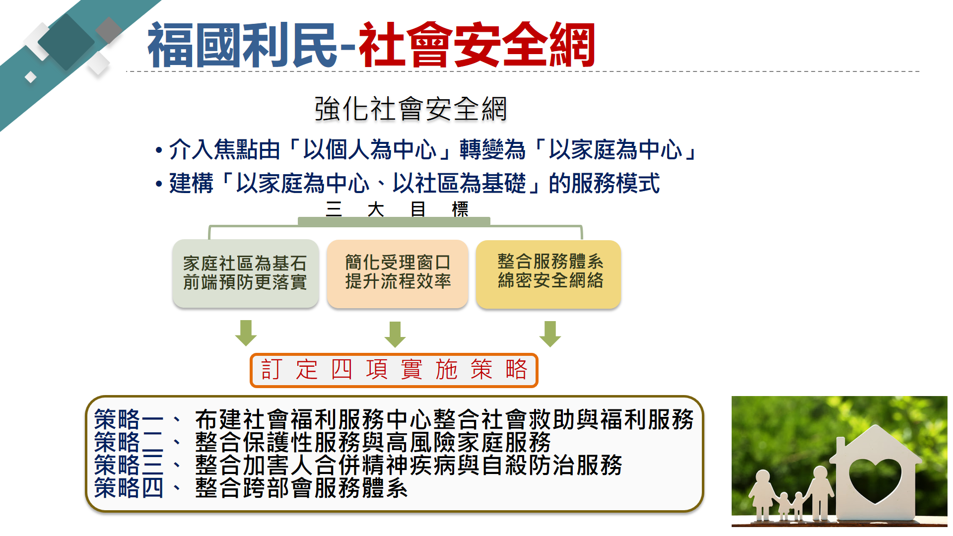 二、在社會安全網方面,以「家庭社區為基石、前端預防更落實」、「簡化受理窗口、提升流程效率」及「整合服務體系、綿密安全網絡」為目標,推動四大策略,並同步充實各地方政府的社工人力,建立制度化薪資結構調高薪資,改善執業環境與勞動條件,穩定社工人員士氣並提升社工專業的服務量能與品質;在推動長照2.0方面,行政院於106年12月19日核定長照十年計畫2.0,全面升級 (包括服務對象升級、服務與據點升級、財源升級、以及人力與薪資升級),建立優質、平價、普及的長照服務體系,提升服務的品質與量能。