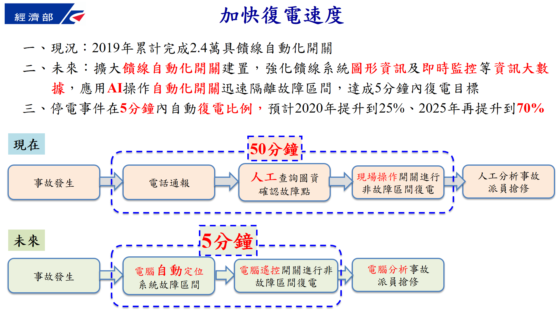 經濟部強調,將持續督促台電公司進行智慧電網的推動,以確保電力穩定供電,並兼顧能源安全、綠色經濟及環境永續,同時落實能源轉型的政策目標。