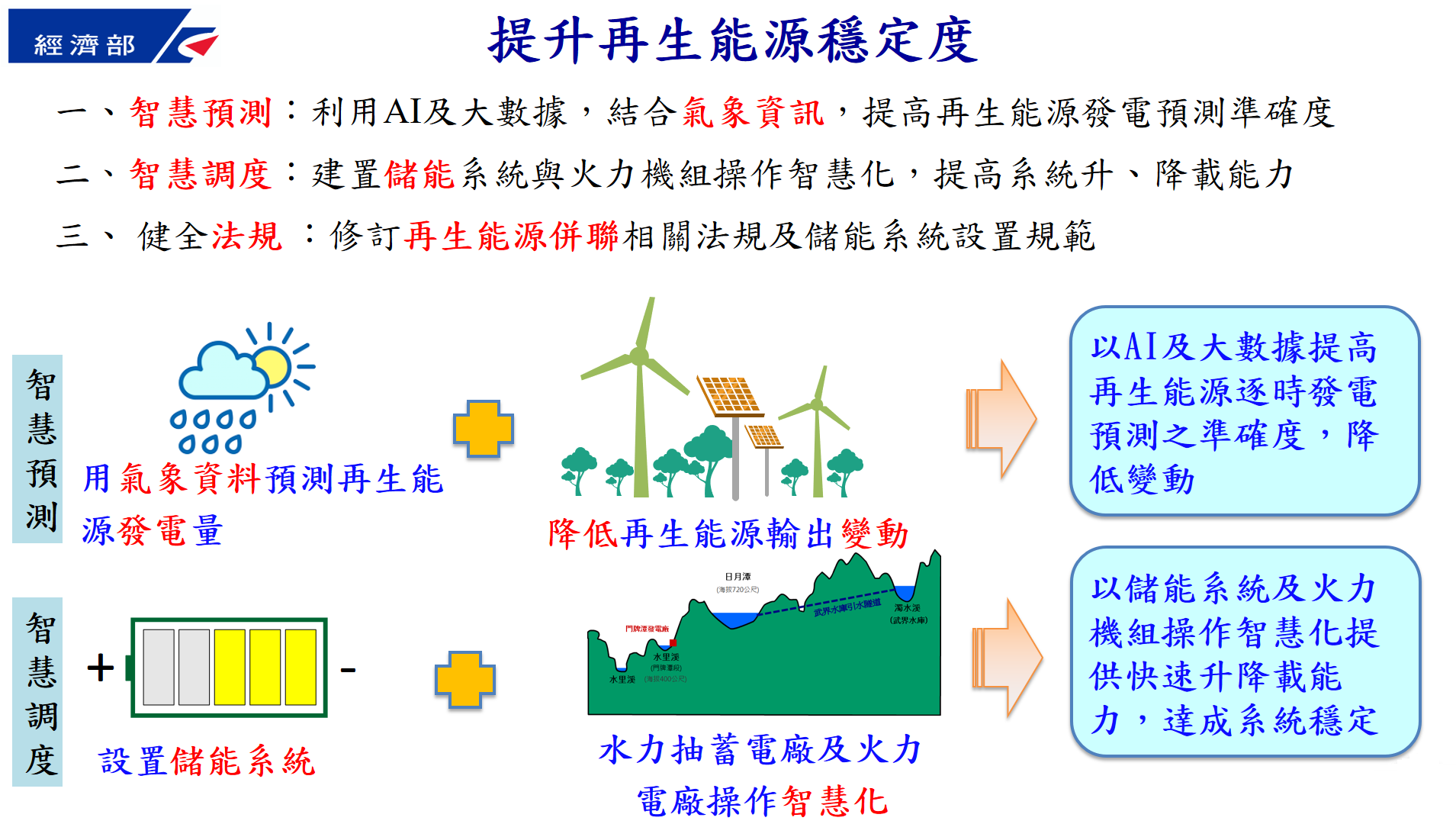 經濟部表示,為因應再生能源快速成長,智慧電網將同時整合氣象、發電資訊及運用儲能系統,以滿足大量再生能源併網需求。經濟部已督促台電公司持續強健電網及靈活調度,並就不同情境規劃補充輔助服務之需求。台電公司將透過建置快速起停新型燃氣機組、調整抽蓄水力運轉模式、精進用戶減少用電措施及建置電池儲能系統等方式,確保大量再生能源併網穩定。
