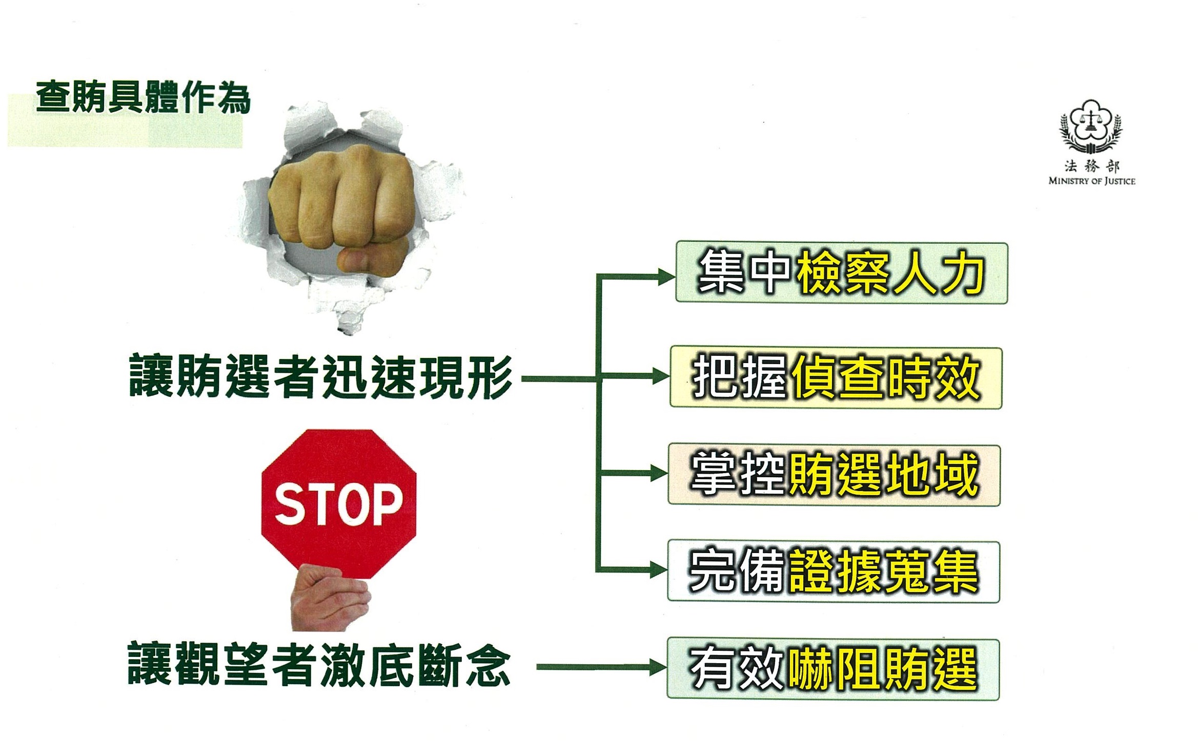 法務部依行政院指示,督導所屬各級檢察機關結合警察、調查、廉政、移民等各查察機關,落實查賄制暴工作,貫徹政府斷絕賄選暴力影響民主政治,維護國家民主根基之決心。具體作為如下: