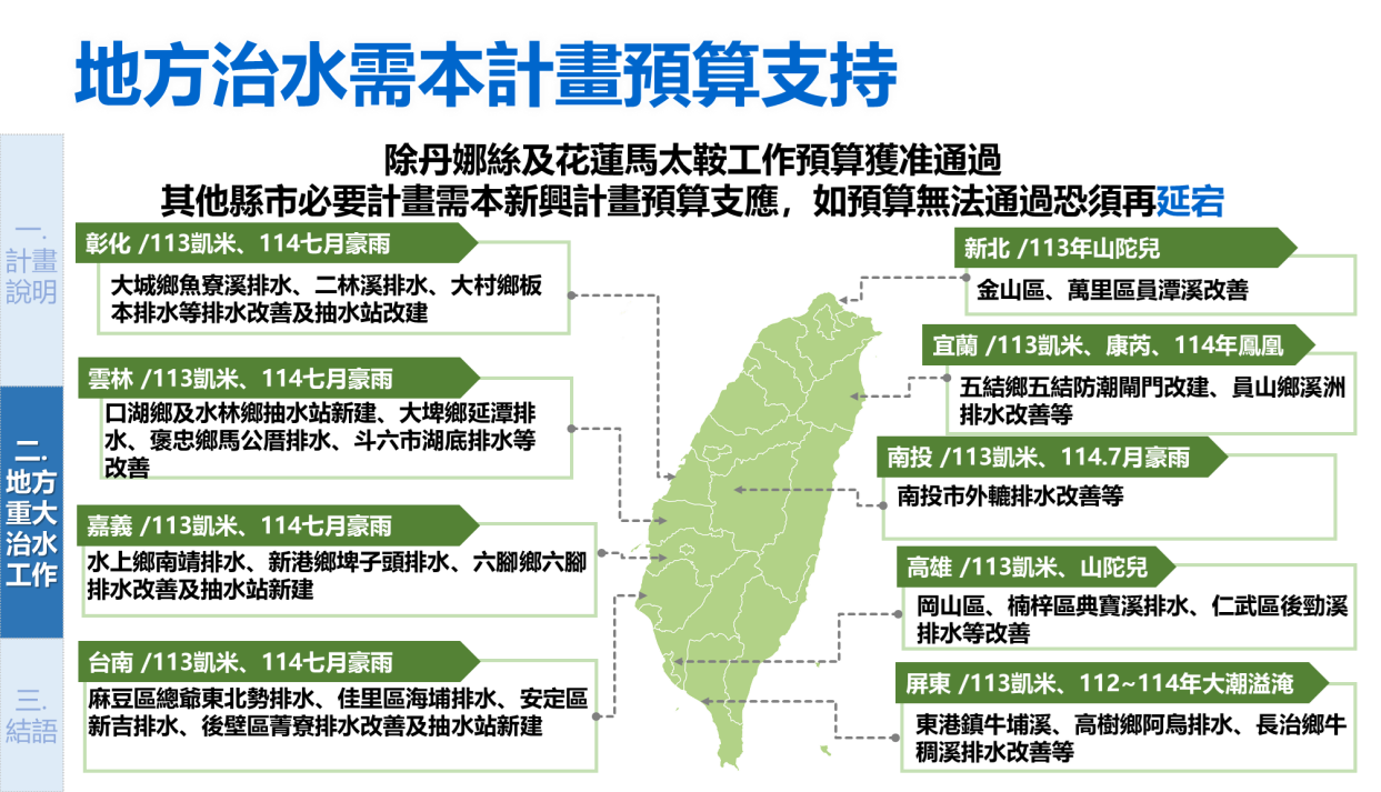本新興計畫於研提階段已盤點各縣市具急迫且人口密集之重點河川排水估算所需治水預算,同時邀集地方政府研商並獲支持,惟地方治水率仍有待提升,亟待本新興計畫4年1,000億元治水經費支應。治水計畫需要延續,治水工程更不能停滯,地方治水需求仍高,如彰化魚寮溪排水、雲林延潭排水、嘉義六腳排水、臺南菁寮排水、高雄典寶溪排水、屏東牛埔溪排水等無法順利通過本新興計畫預算,地方重大治水工作恐須再延宕。
