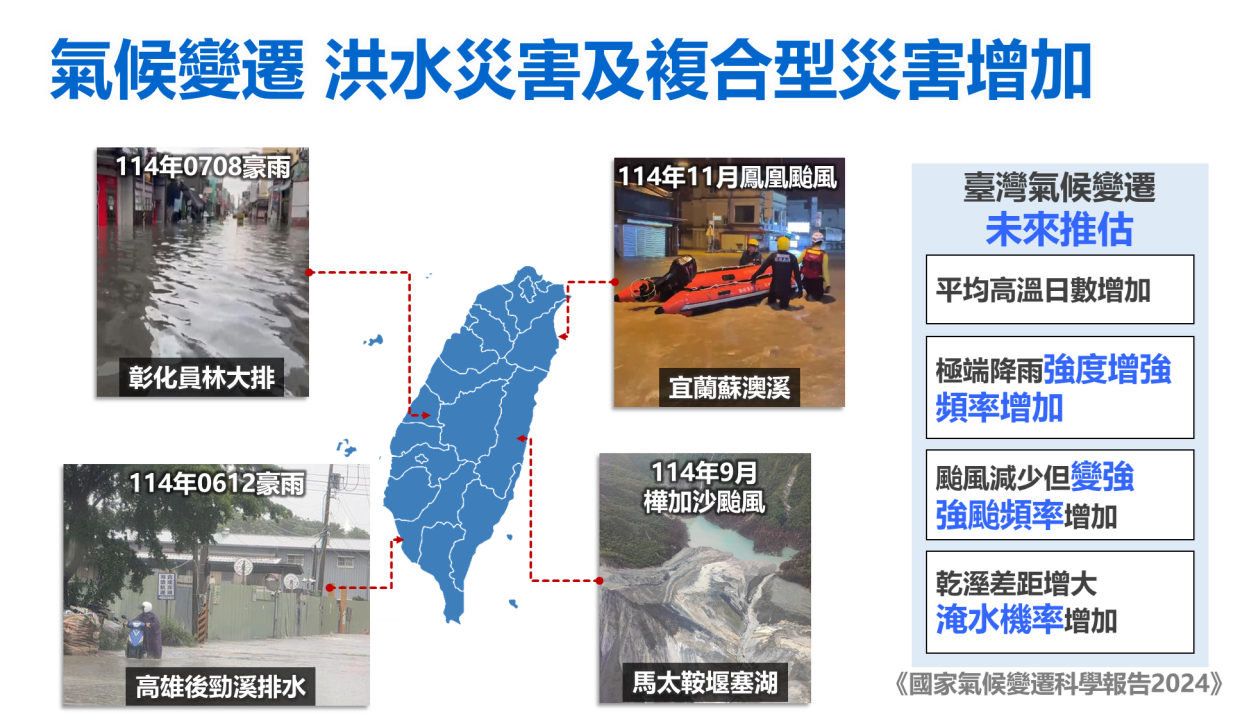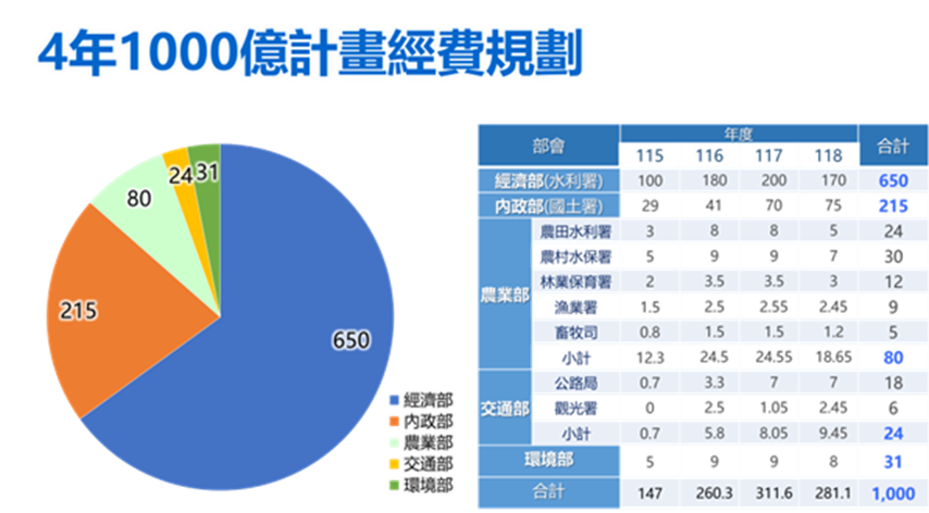 經濟部依114年7月31日於本院第3963次院會報告「因應氣候變遷縣市管河川及排水整體改善計畫」,為加速治水工程進行,修正計畫期程調整為4年(115-118年),總經費維持1,000 億元,本院於114年12月4日核定本新興計畫。本院自95年起陸續核定易淹水地區水患治理計畫(95-102年)、流域綜合治理計畫(103-108年)及前瞻-縣市管河川及區域排水整體改善計畫(106-114年),透過部會協調與資源整合,治理率從19%至113年已提升至45%,協助地方政府改善高淹水風險地區的縣市管河川及排水,執行迄今已有成效。