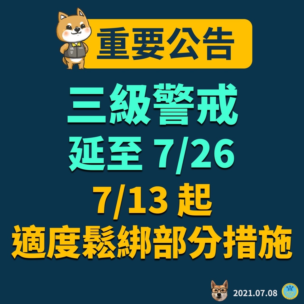 一、在國人共同努力配合下,國內嚴重特殊傳染性肺炎(COVID-19)疫情已在控制中,確定病例數持續保持在兩位數,目前防治措施持續聚焦在「發掘潛藏於社區內的散發病例」及「阻斷各場域群聚事件發生」兩大重點。中央流行疫情指揮中心(以下簡稱指揮中心)已宣布全國疫情警戒第三級延長至110年7月26日止,並自7月13日起適度鬆綁部分措施如下,各地方政府得視疫情需要因時因地調整,鬆綁措施仍應遵照通案性原則及主管機關指引,包含實聯制、出入口管制、人流管控降載、維持社交距離,除飮食外,全程戴口罩、員工人員健康管理、確診事件即時應變。
