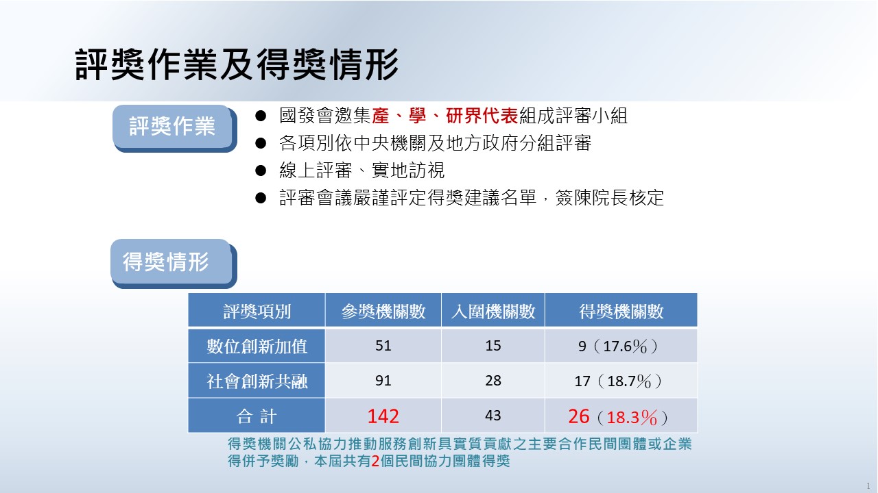 國發會邀集產、學、研界代表組成評審小組,就各項別依中央機關及地方政府分組評選,透過線上書面評審,以及實地訪視入圍機關,經評審會議嚴謹討論評定,計有26個機關(構)得獎,服務內涵多能關注不同的服務對象,展現在地服務亮點特色。