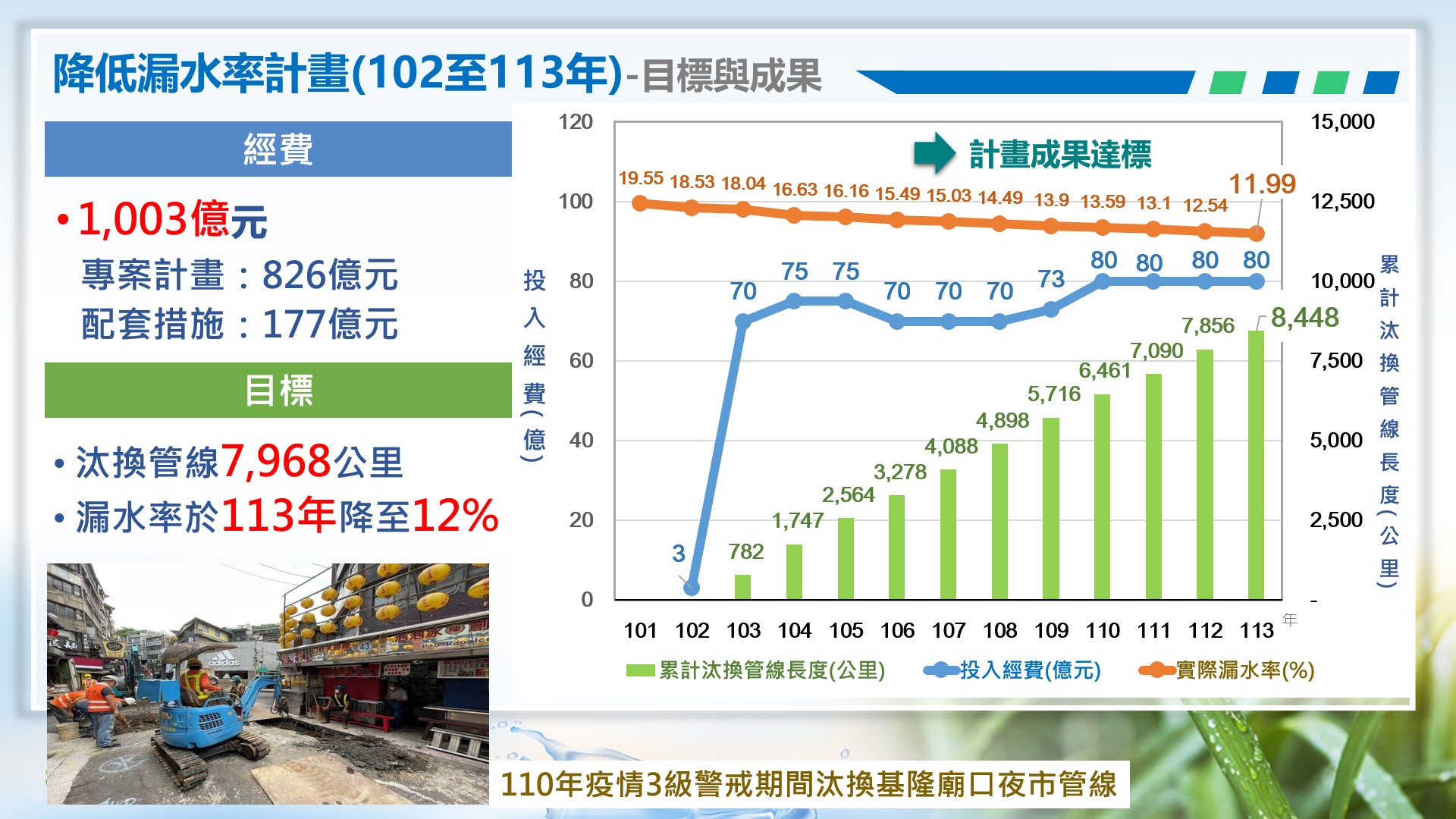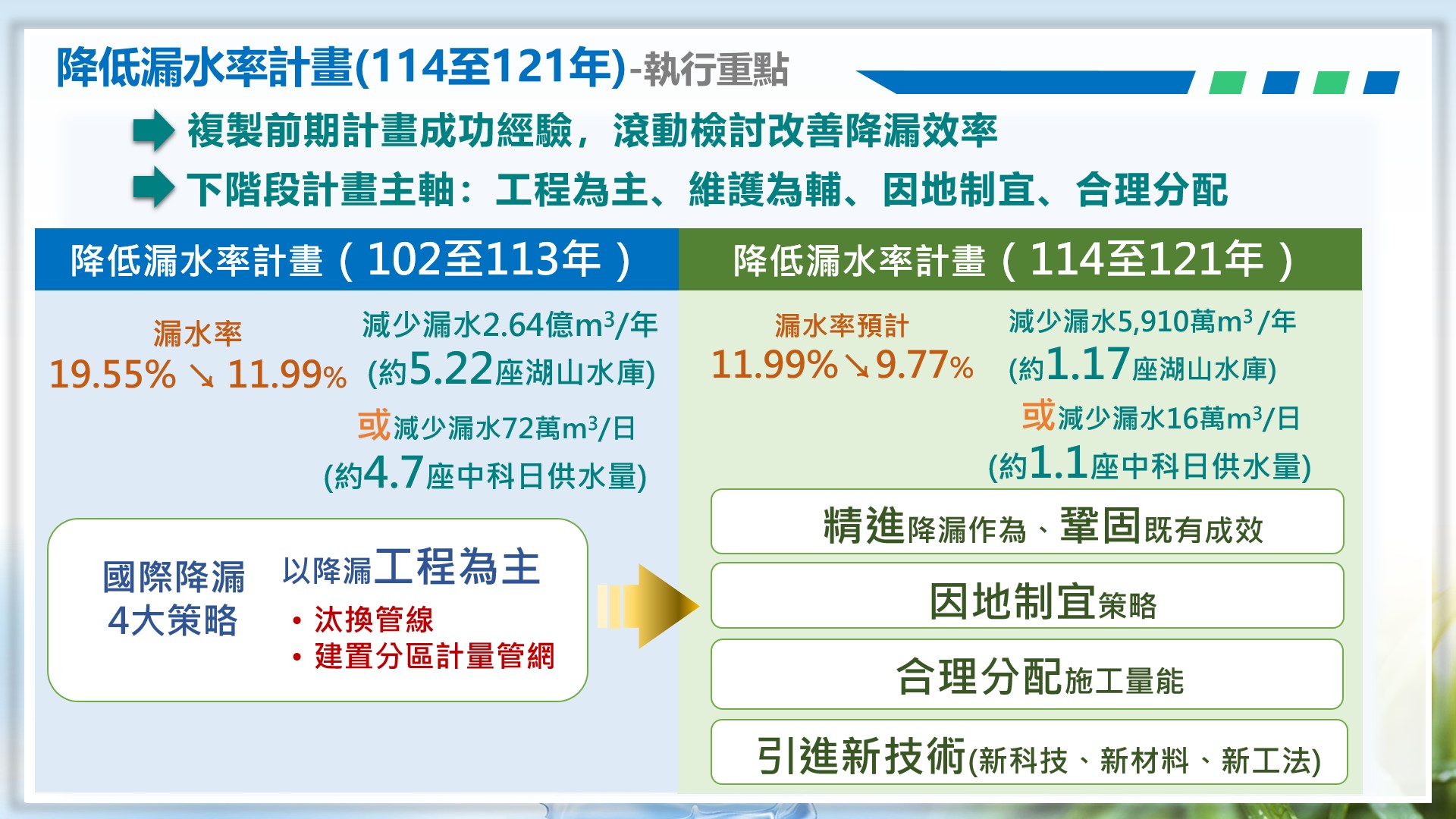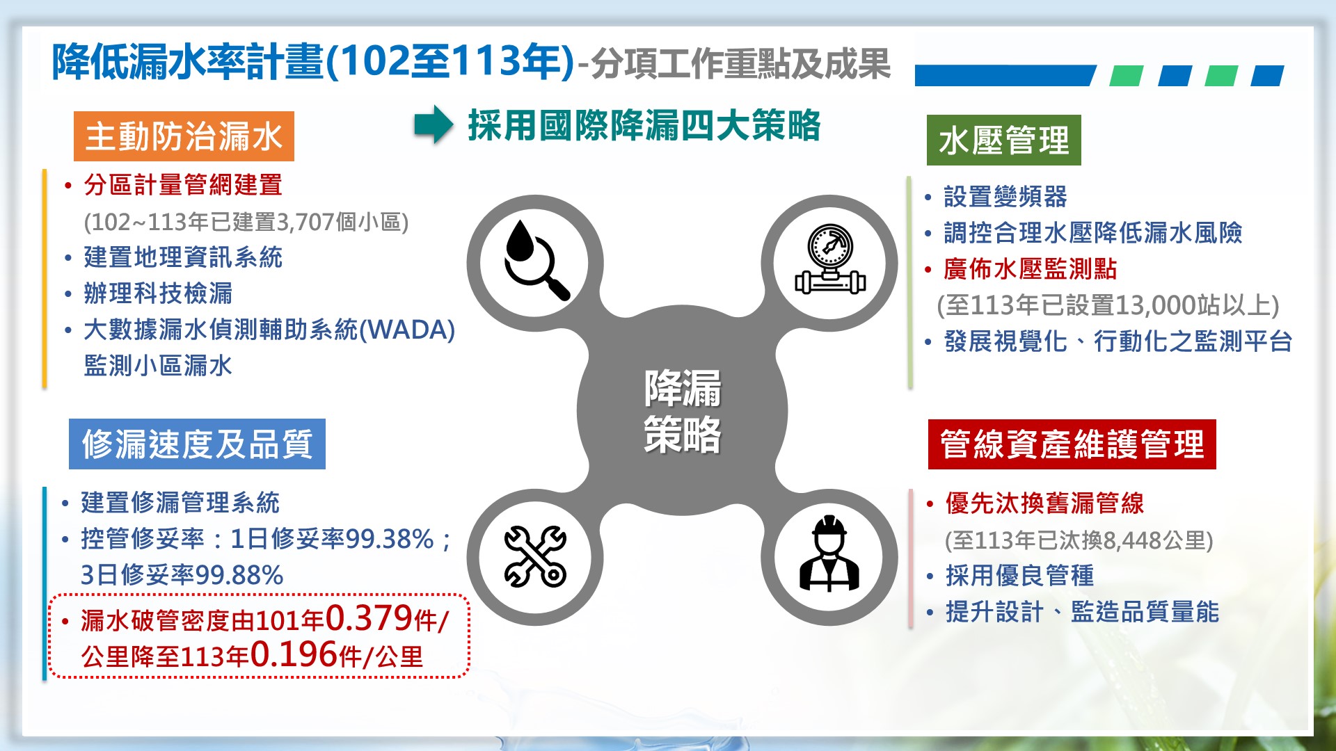 經濟部自102年起投入1,003億元推動「降低漏水率計畫(102至113年)」,採用國際常用的「水壓管理」、「提升修漏速度及品質」、「主動防治漏水」、「管線資產維護」4大策略來改善自來水漏損,台水公司漏水率已由101年底19.55%降至113年11.99%,未來每年約可節省2.64億立方公尺水量,約為5.22座湖山水庫有效蓄水容量,亦等同減少每日漏水72萬立方公尺,約為4.7座中科日供水量。