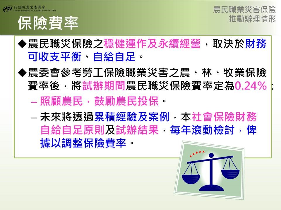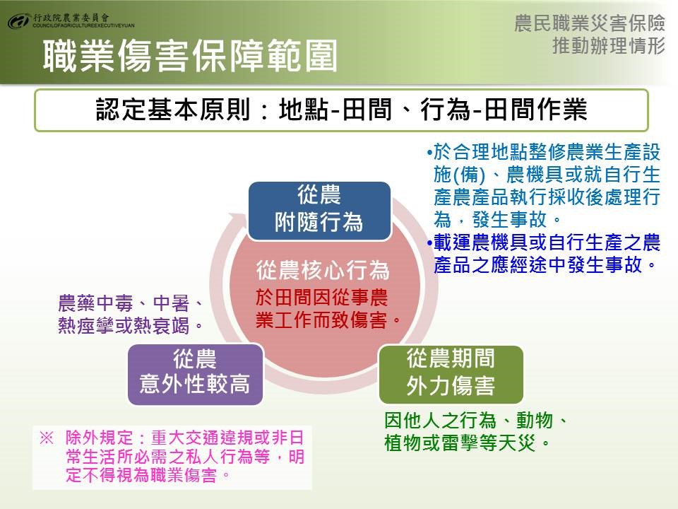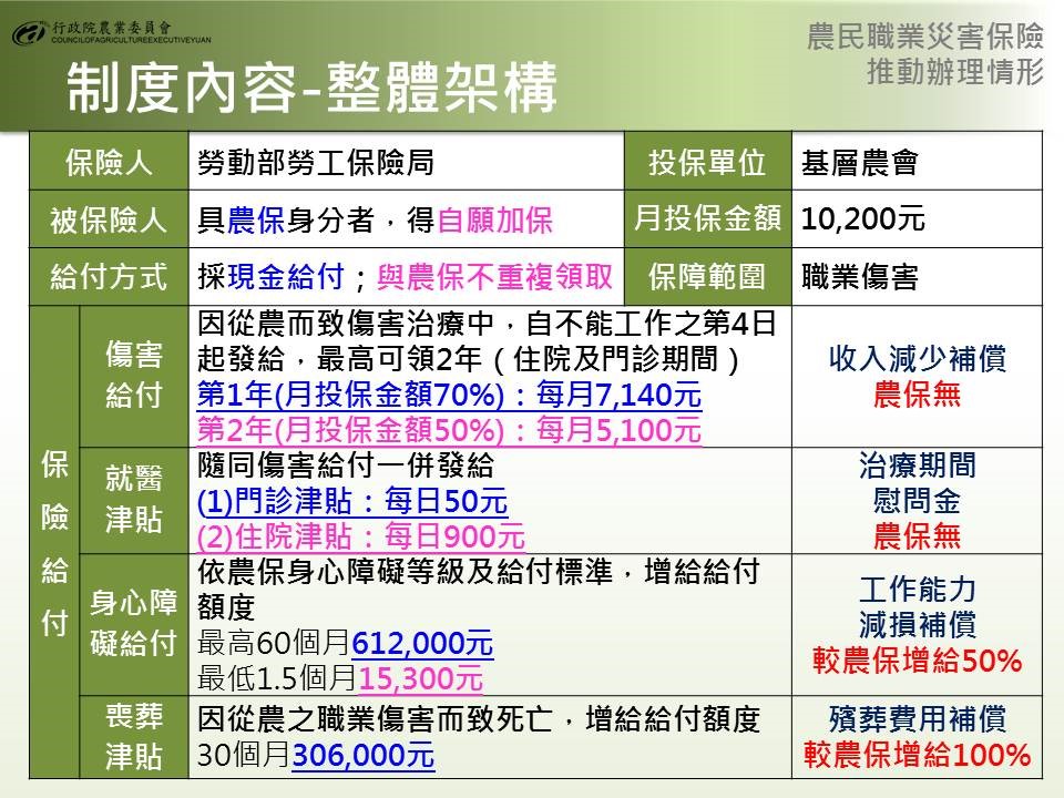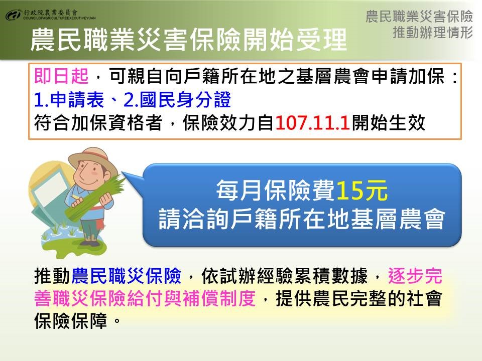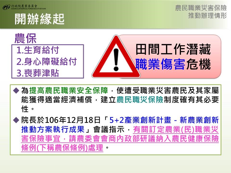 農民在田間工作潛藏職業災害危機,農民健康保險(下稱農保)計有生育給付、身心障礙給付及喪葬津貼等3項,當農民發生職業災害時,並無特別給付保障。為增進農民職業安全及經濟補償,使遭受職災農民及其家屬能獲得更完整保障。農委會自今年2月起即推動實際耕作從事農業生產者可參與農保,讓許多即使沒有農地,但有志於農業的年輕人可享有更多元保障。行政院則於106年12月18日「5+2產業創新計畫-新農業創新推動方案執行成果」會議決議:「有關訂定農業(民)職業災害保險事宜,請農委會會商內政部研議納入農民健康保險條例(下稱農保條例)處理」。