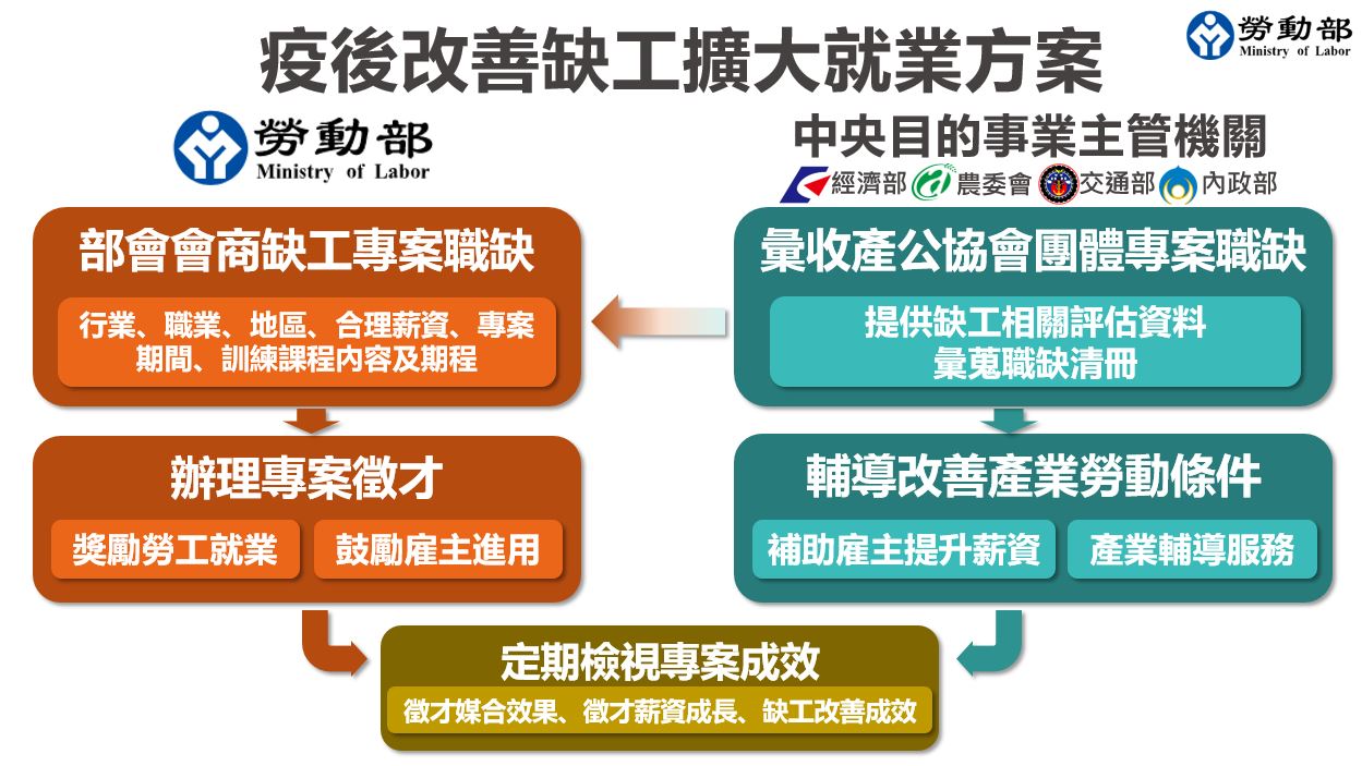 為改善疫後產業缺工問題,勞動部規劃「疫後改善缺工擴大就業方案」,建立跨部會合作機制,設定「專案職缺」範圍及薪資標準等具體條件,從「獎勵勞工就業」及「鼓勵雇主僱用」,運用方案之獎補助資源,協助企業補實人力需求。