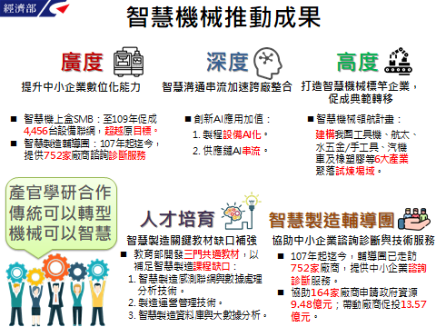 經濟部自105年起推動「智慧機械產業推動方案」,整合我國豐沛的新創能量,建立符合市場需求之技術應用與服務能量,將臺灣從精密機械升級為智慧機械,配合產業投入與發展,政策成果深獲業界肯定。透過廣度、高度及深度等策略,結合產業界、政府單位、公協會、學術界及法人等單位跨域合作,帶動產業智慧化升級轉型,以達成「智機產業化」及「產業智機化」之目標。主要成果包含:智慧機上盒(SMB)、AI應用加值、智慧機械產業領航、智慧製造關鍵教材、智慧製造輔導團及國際合作等,推動成果內容說明如下: