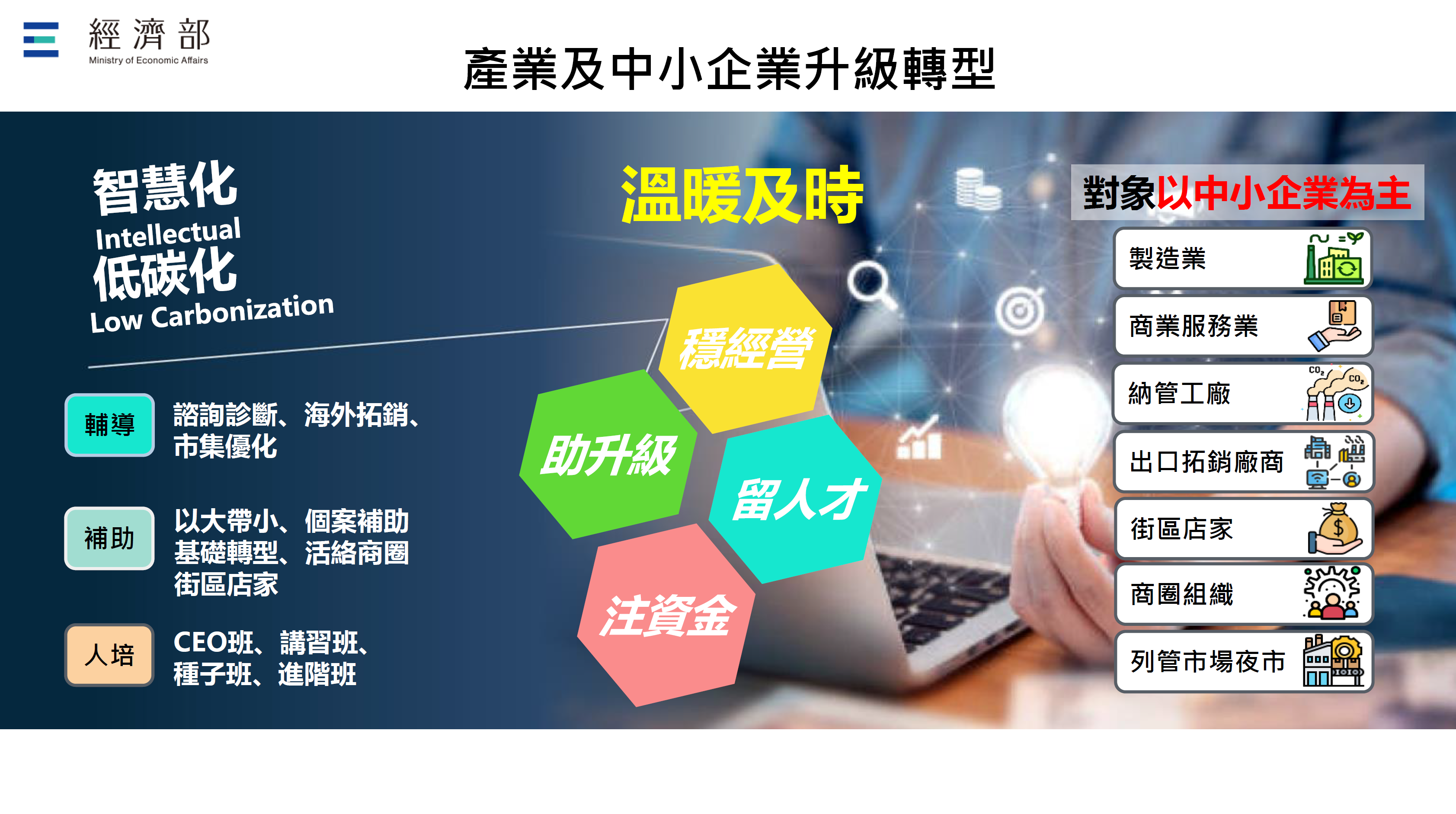 相關措施包含「協助製造業及商業服務業推動智慧化、低碳化」、「活絡商圈及特色街區」、「協助中小企業出口拓銷」,以及提供「疫後振興」及「轉型發展」專案貸款。推動至今已逾1年,各界反應熱絡,廠商不斷詢問輔導及補助細節。未來將持續運用疫後特別預算,為產業提供輔導、補助及人才培訓資源,協助企業強健營運體質、邁向升級轉型。