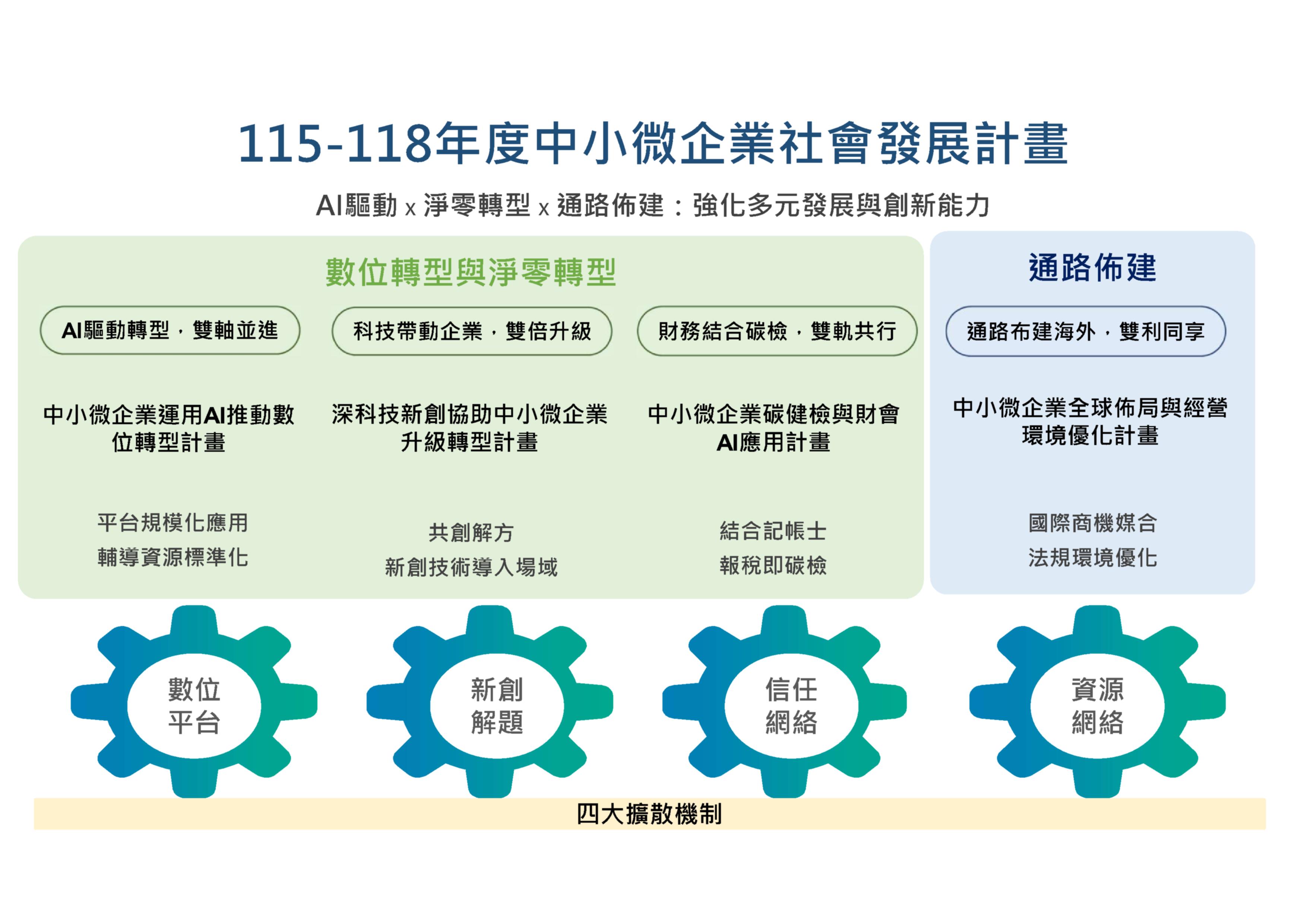 為擴大中小微多元振興發展計畫輔導涵蓋率,經濟部提報115-118的四年期社發計畫,持續投入資源,擴大服務更多企業,強化中小微企業提昇雙軸轉型的量能,帶動包容性成長。這次的四年計畫,透過「四支箭」擴散,針對不同目標產業與族群,提出具體輔導做法,以解決中小微企業在數位與淨零轉型中所遭遇之困難。