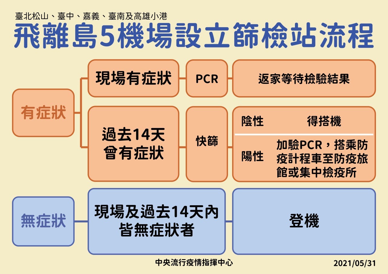 三、為避免疫情散播及確保航空器防疫安全,指揮中心經評估後,同意交通部民航局所屬臺北松山、臺中、嘉義、臺南及高雄小港航空站設立篩檢站。旅客搭乘國內航線前往離島時,應於搭機前填寫「健康聲明書」,現場有症狀者不可搭機,且應配合病毒核酸檢測;若為過去14天內有症狀者,須現場配合接受抗原快篩檢驗且為陰性,始得搭機。經抗原快篩檢驗陽性的旅客,將由航空站安排搭乘防疫計乘車送至衛生單位指定防疫旅館或集中檢疫所。