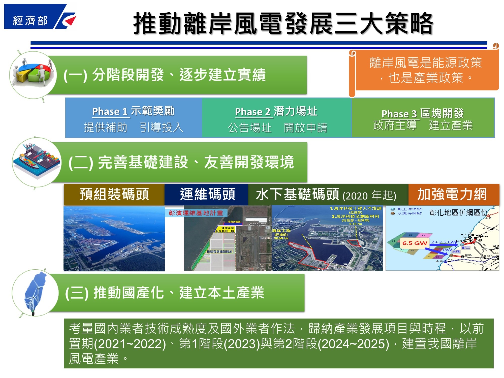 為推動我國能源轉型,經濟部以兼顧能源安全及產業發展為前提,規劃「風力發電4年推動計畫」,以「先示範、次潛力、後區塊」之策略推動離岸風電,現已完成第2階段潛力場址5.5GW之招商作業,我國首座離岸示範風場亦即將展開施工,後續經濟部將採取以下策略,積極推動離岸風電發展、建立在地產業鏈: