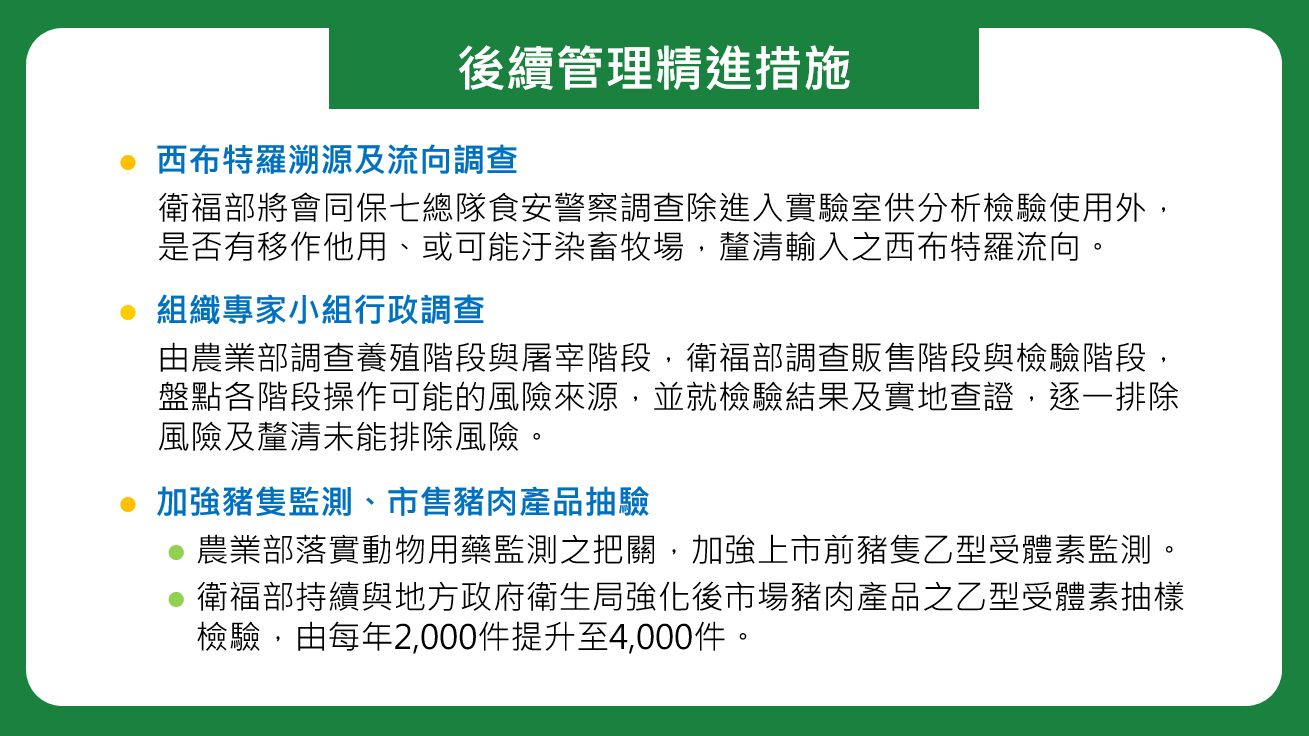 雖本案研判屬於單一檢體問題而非系統性事件,為了讓民眾安心,政府以嚴謹的態度審慎應處,將持續針對西布特羅輸入溯源及流向查核,並且組織專家小組進行討論,盤點各階段操作可能的風險來源,及進行微量輸入西布特羅流向調查等,以釐清事件真相與發生原因,並避免再次發生。
