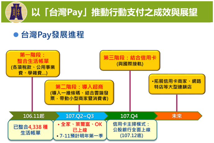 二、「台灣Pay」推動迄今1年多,獲國內大型民營銀行、大型電支電票業者及四大超商之支持,在帳戶數、商家數、參與金融機構及交易量等均呈現大幅成長。「台灣Pay」提供繳費、繳稅、轉帳及消費等支付服務,為民眾數位金融帶來的便利,漸具成效。截至107年10月底已整合25家金融機構,使用者近532萬戶,店家數達5萬家,交易金額新臺幣134億元,整合4,338種生活帳單(涵蓋各項稅款、公用事業費、學雜費等),導入四大超商支付(萊爾富107年7月、全家及OK11月上線;7-11預計108年第1季導入),更於107年11月與國際信用卡結合,提供民眾行動支付完善的應用生活圈。