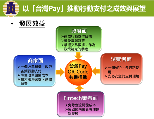 一、為因應金融科技發展趨勢及協助落實行政院2025年行動支付提升至90%的政策目標,財政部於106年9月督導公股銀行與財金資訊股份有限公司合作共同推動「台灣Pay」行動支付,將國內QR Code規格標準化,強化安控機制並與國際接軌,建構我國安全便捷之行動支付環境。