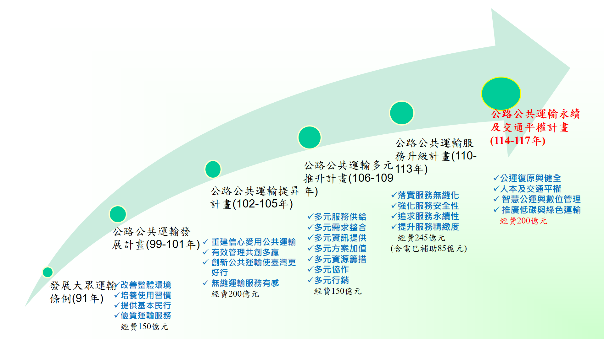 一、交通部自99年開始辦理公路公共運輸計畫(簡稱公運計畫),迄今辦理四期計畫,在中央與地方政府及公車業者之努力合作下,已顯著改善公車之軟硬體設備及服務品質;尤其是資源較不充足的縣市,藉由公運計畫之補助經費,在增加路線、車輛、候車亭、智慧站牌等方面都有相當成果。疫情前公車載客量從98年至108年間成長20%,成功扭轉運量下跌趨勢;惟109年起受疫情影響運量大幅下滑,至111年下半年起疫情對公共運輸之直接衝擊方才逐漸淡去,然而民眾旅運習性已產生明顯改變,加上疫情期間公車駕駛員流失問題尚未完全消除,使得公車載客量回升速度較緩慢,以最新一期運量113年4月為例,市區公車運量相較疫情前108年同期仍有19%跌幅,公路客運則仍有38.3%跌幅。疫情發生後交通部藉由防疫紓困措施及辦理公運計畫得以將公車路線停駛、減班及不續營等棘手問題控制在小範圍內,不至於出現骨牌效應全面發酵,軟硬體設備亦持續有所精進;考量公車業者剛從疫情帶來之嚴重衝擊中脫離,經營體質仍顯孱弱,致營運態度傾向保守,拓展業務能力不若以往,因此交通部期望在第四期公運計畫屆期後,能持續投入資源協助公車業者加速經營體質之復原及健全,俾利永續維運,同時能在既有基礎下持續提升服務品質與競爭力並擴充服務量能,以利促進低碳與綠色運輸推廣以及落實人本與交通平權理念等重要政策,並帶動產業升級,爰提出第五期公運計畫「公路公共運輸永續及交通平權計畫(114-117年)」。