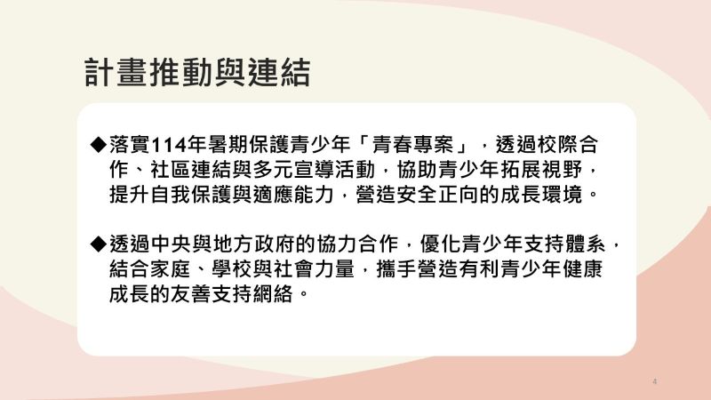 一、為守護青少年於暑期的身心安全,中央與地方政府共同辦理「青春專案」,並透過校園、家庭與社會的聯合力量,強化宣導教育、預防介入與多元參與機會,引導青少年度過充實且安全的假期生活。