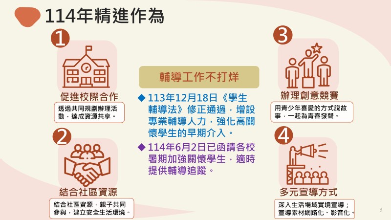 二、本次青春專案依據內政部114年度工作計畫執行,內容涵蓋嚴防新興毒品、遏止組織犯罪、打擊詐欺、防制性暴力等議題,教育部從四大面向推動措施如下: