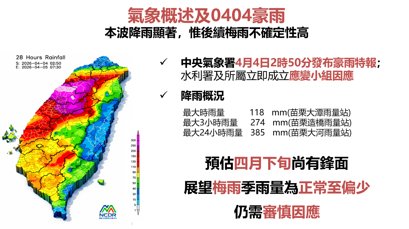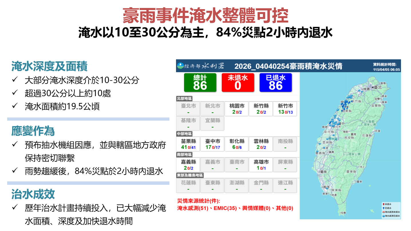 (一)0404豪雨氣象概述及應變說明:中央氣象署4月4日凌晨發布豪雨特報後,經濟部水利署於3時立即成立應變小組因應,應變期間向地方政府及橋梁單位災害告警共計37次;本次事件共計有86處淹水,主要為道路、車行地下道淹水,雨勢趨緩後,84%災點於2小內退水。